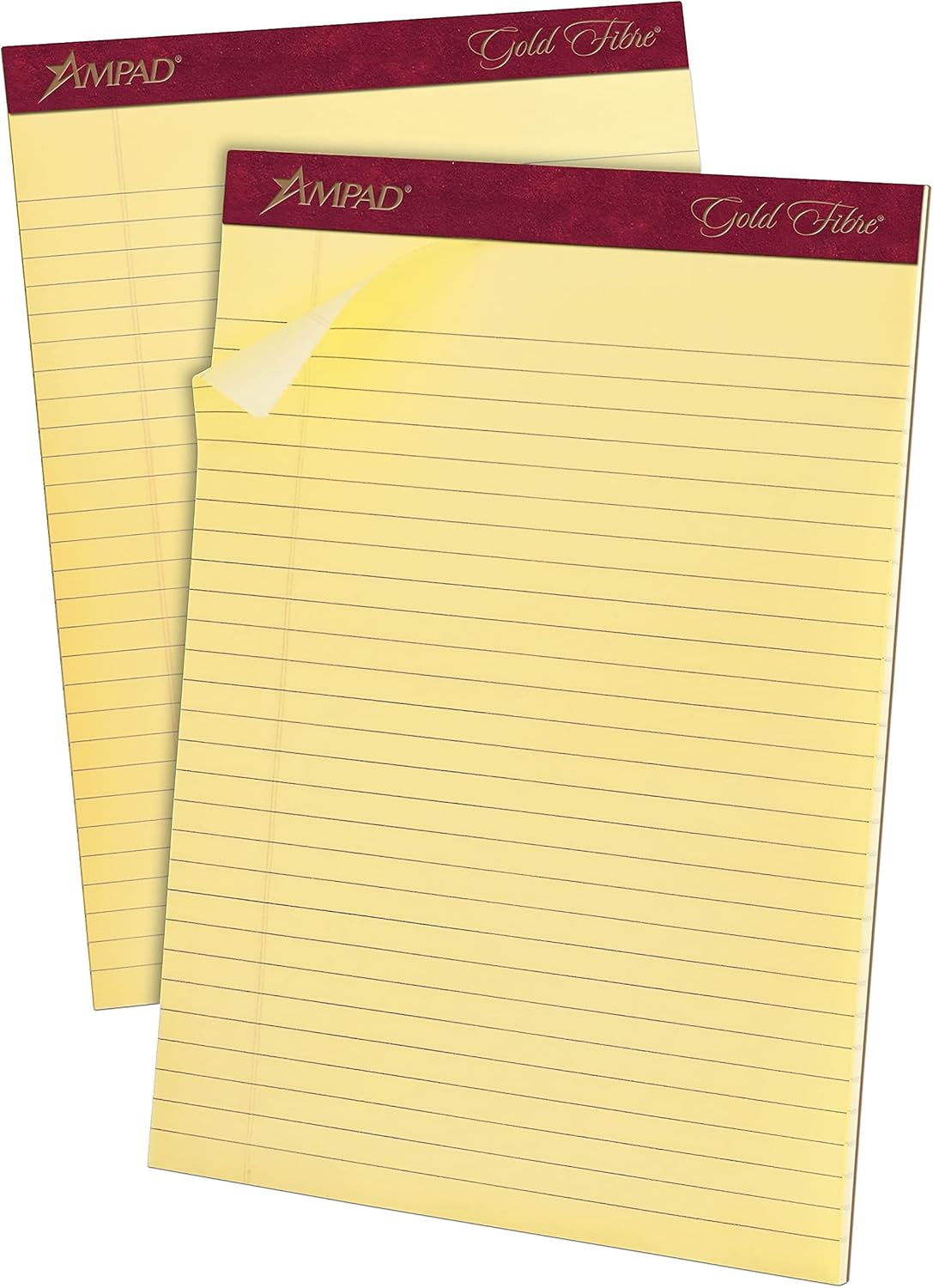 Ampad Gold Fibre Writing Pads have smooth, premium-weight writing paper that resists ink bleeding and show through, with extra-strong backs for firm writing support. The classic format long preferred by attorneys and professionals gives you quick access to notes and lists. Micro-perforated sheets detach easily for tidy, organized notes. 8-1/2" x 11-3/4". Canary paper. Legal ruled, 50 Sheets. 12 Pack.