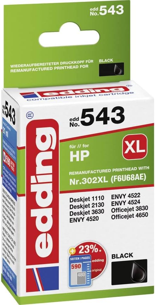 edding EDD-544 Ink Cartridge Replaces HP 302XL (F6U67AE) You can also rely on edding quality when printing. Reliable print quality and flawless function at an attractive price – edding offers a high-quality range of printer cartridges and remanufactured toner cartridges in the field of printer accessories. The products offered by edding meet or exceed the highest quality standards and offer a reliable alternative for original cartridges from Canon, Epson, HP and Brother. Compatible with the following printer models: HP DeskJet 1110, DeskJet 2130, DeskJet 3630, DeskJet 3631, DeskJet 3632, DeskJet 3633, DeskJet 3634, DeskJet 3635, DeskJet 3636, DeskJet 3637, DeskJet 3639, Envy 4520 e-All-in-One, Envy 4521. e-all-all-one-one, enenvy 4522 e-All-in-One, Envy 4524 e-All-in-One, Envy 4525 e-All-in-One, Envy 4526 e-All-in-One, Envy 4527 e-All-in-One, Envy 4528 e-All-in-One, OfficeJet 3800, OfficeJet 3830, OfficeJet 3831, OfficeJet 3832, OfficeJet 3833, OfficeJet 383 4, OfficeJet 3835, OfficeJet 4650, OfficeJet 4654, OfficeJet 4655, OfficeJet 4656, OfficeJet 4657, OfficeJet 4658