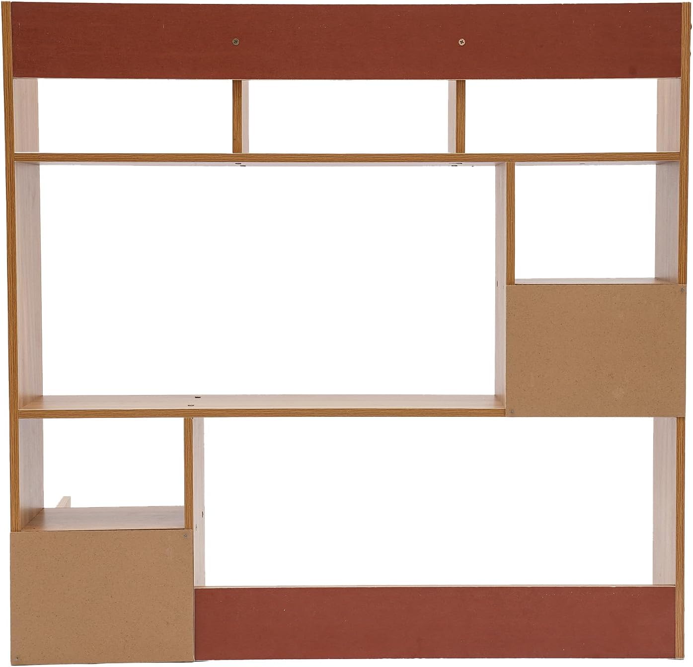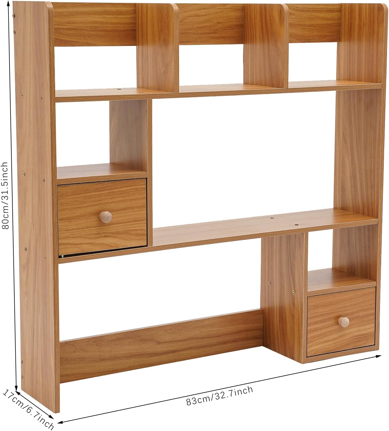 DetailsOpen Storage Compartment: It makes it possible to display your books and other collectibles, and it's also easy to grab and go.Smooth Edges: The smooth, round, and burr-free edges make it safer for you to install and clean the product.ApplicationIt is suitable for study rooms, offices, bedrooms, libraries, reading rooms, schools, classrooms, and living rooms to organize books, office supplies, stationery, files, collectibles, and other items.SpecificationsMaterial: MDF, Plywood BoardProcess: Veneer Style: ModernMount Type: Tabletop MountAssembly Required: YesNumber of Compartments: 9Thickness: 11mm/0.43in, 2mm/0.08inLoad Capacity: About 10kg/22.05lbsProduct Size: 83*17*80cm/32.68*6.69*31.5inPackage Size: 92.5*19.5*11cm/36.42*7.68*4.33inGross Weight: 7.7kg/16.98lbsNet Weight: 7kg/15.43lbsPackage Included1*Desktop BookshelfAll Accessories for InstallationNotes1. We recommend that it be installed by two people. 2. This product does not include books and other decorations.3. Please allow the slight color difference caused by the shooting light and 1-3cm error due to manual measurement, and make sure you do not mind before you order.