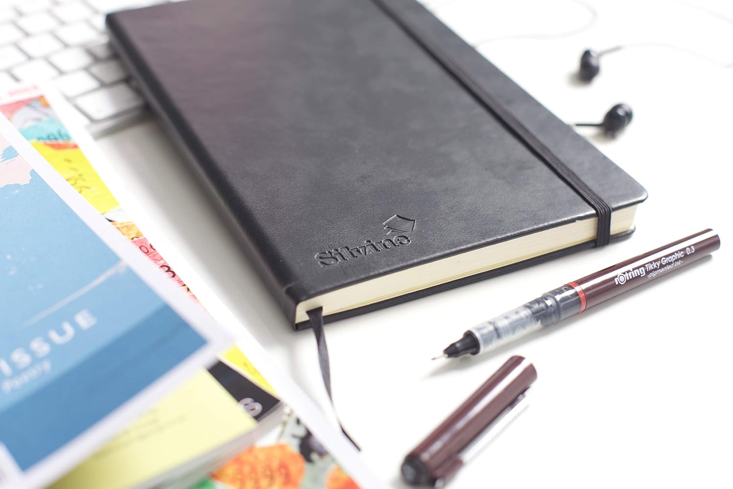 Soft feel cover material. Elasticated strap. Colour coded marker ribbon. Fold out pocket on inside back cover. Ruled cream paper. 160 pages (80 sheets). 90gsm. Size: A5. Black.
