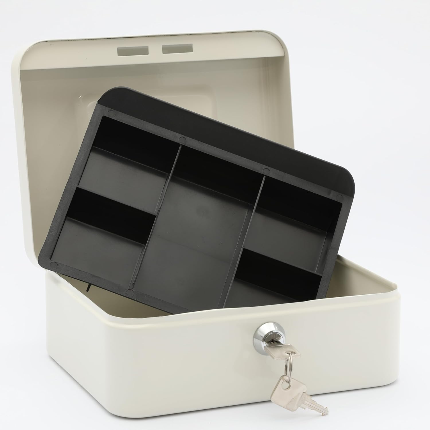 Product Description WEDO 145 200X Cash box in White Size 2. Made from heavy gauge welded steel. Fitted with strong lock and supplied with 2 keys. Key Number engraved on keylock. Complete with removable plastic coin tray. Carrying handle rests flat in recess in lid for easy stacking. Size: 20.0 x 16.0 x 9.0 cm. Set Contains: 1 Cash Box