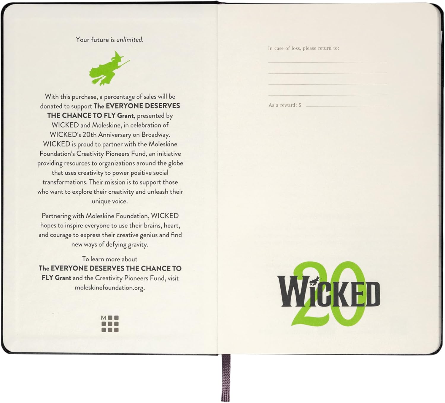 In celebration of WICKED’s 20th Anniversary on Broadway, WICKED has partnered with Moleskine to create grants for students and educators looking to further their education or the education of others. The mission is to support those who want to explore their creativity—and unleash their unique voice. With Moleskine, WICKED hopes to inspire everyone to use their brains, heart, and courage to express their creative genius … and find new ways of defying gravity. With this purchase, a percentage of sales will be donated to support the EVERYONE DESERVES THE CHANCE TO FLY GRANT, Presented by Wicked, Moleskine and the Moleskine Foundation.