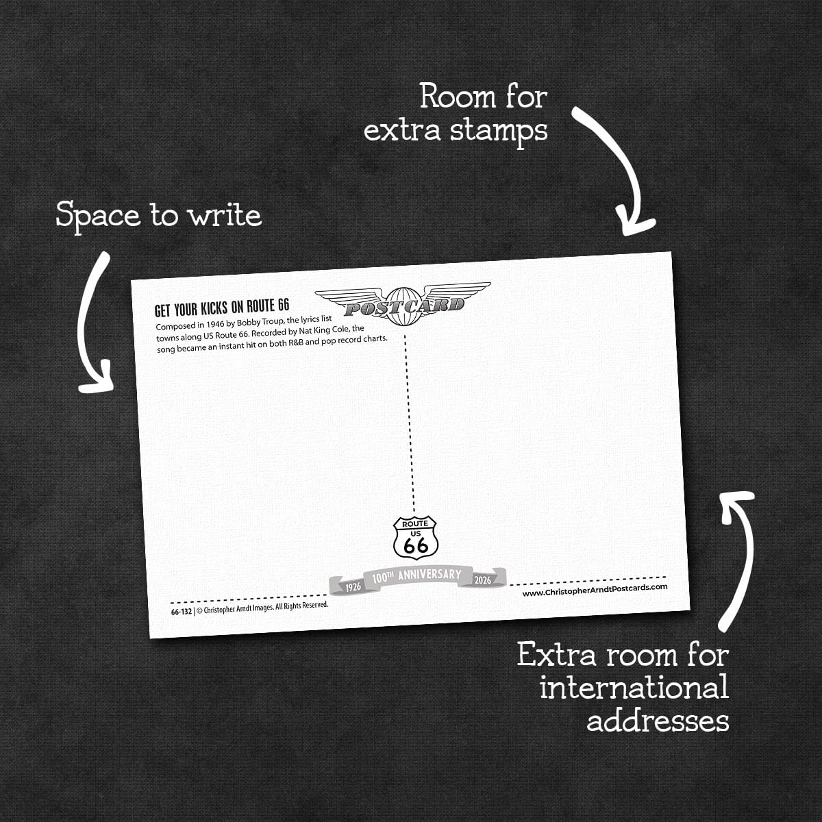Journey through the heart of America with this set of Route 66 Centennial postcards—a tribute to 100 years of freedom, adventure, and open‑road discovery. This postcard set of 36 postcards captures the legendary highway’s most iconic landmarks and nostalgic roadside attractions, inviting you to relive the golden age of travel and share in the enduring spirit of the Mother Road. The perfect way to celebrate the 100th Anniversary of Route 66.