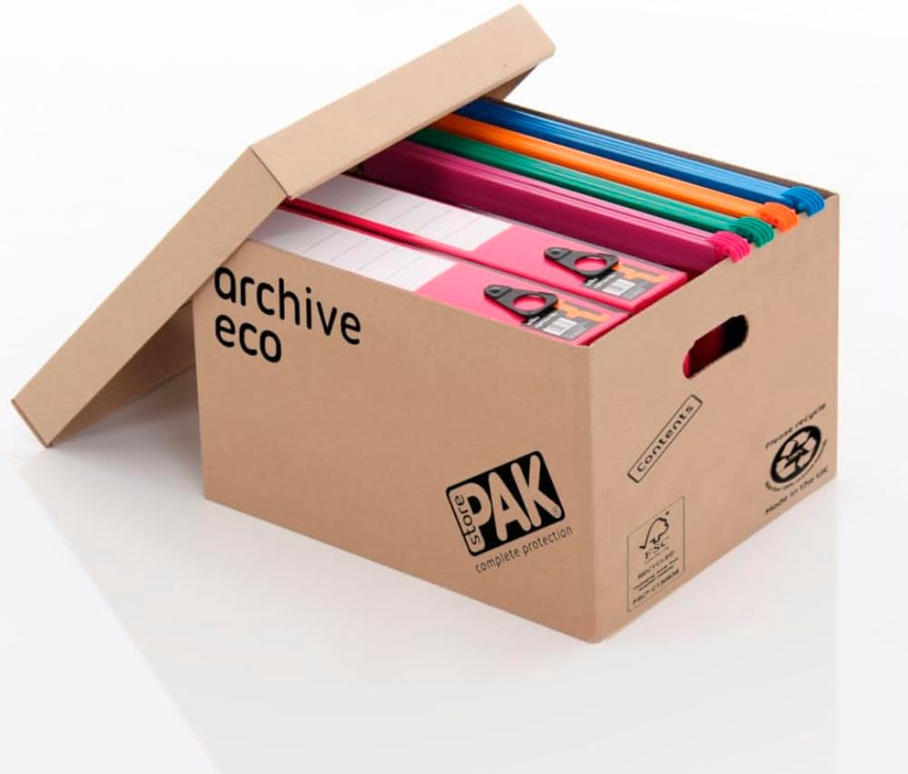 Product Description Discover the StorePAK ECO ARCHIVE Storage Boxes – your ultimate solution for organised, eco-conscious storage. Crafted from durable cardboard, these boxes are stackable and reusable, ensuring long-term use while supporting sustainability with 100% recycled FSC-certified material and a commitment to recyclable plastic. Effortless assembly and handling are guaranteed with integrated handles, locking bases, and lids. Ideal for paperwork, lever arch files, or general home and office storage, these boxes offer a generous capacity of 33 litres each. Compact yet sturdy, these boxes neatly stack in garages, offices, or lofts, maximising space efficiency. Featuring convenient hand holes, they are practical for various storage needs. Each pack contains 10 Eco Archive Base & Lid sets. Elevate your storage game with these eco-friendly, durable, and practical boxes—perfect for keeping your space organised during moves or for ongoing storage needs. Set Contains: 10 x Eco Archive Base & Lids