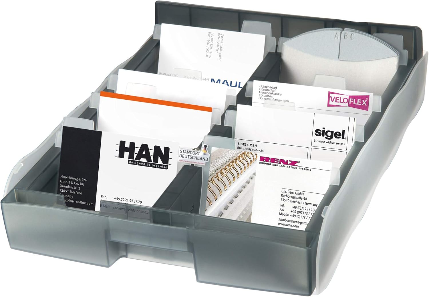 Business card box VIP XXL, holds approx. 2,200 cards A8. Complete with 8 adjustable support plates and a 16-part designer set of guide cards A - Z. When open, the customizable lid slides underneath the box. Fitted with inscription label for easy orientation. Vertically multi-stackable. Supplied with 16-part A-Z guide cards (Item # 9881) and 8 adjustable support plates (Item # 9038-63). Capacity: 2,200 cards. For card format: A8 landscape. Made in Germany. Material: high-quality plastic, polyproylene (PP). Outer dimensions (W x D x H): 215 x 300 x 68 mm. Colour: translucent grey.