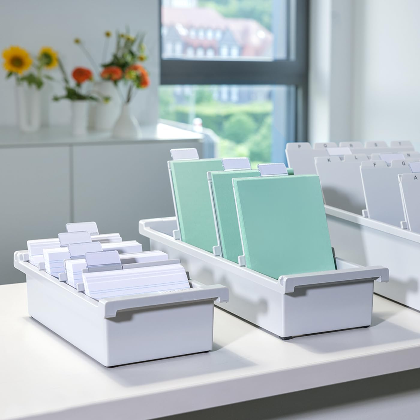 Card index tray A7 landscape, holds 1,300 cards. Complete with 2 support plates and sliding file clips. Ideal for intelligent information processing in high-quality finish. Suitable for most desk drawers. Non-slip rubber furniture protectors ensure a firm grip. Supplied with 2 support plates (Item # 9026) with clear file clips (Item # 9001). Capacity: 1,300 cards. For card format: A7 landscape. Made in Germany. Outer dimensions (W x D x H): 128 x 347 x 66 mm. Material: high-quality plastic, polystyrene (PS). Colour: light-grey.
