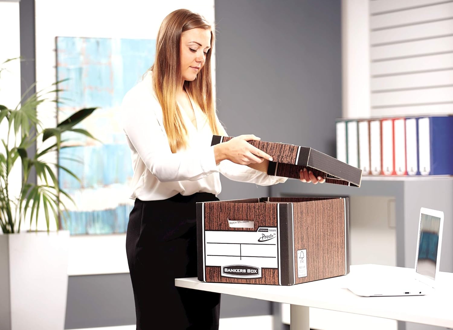 Product Description PRESTO instant assembly - just push the corners together and the box is ready for use. Accommodates A4 and foolscap documents, folders, ring binders and Bankers Box Premium transfer files. Lid protects from dirt and allows stacking up to 6 high. Convenient tote carry handles. Packed flat for easy assembly. Made from FSC certified 100% recycled board, 100% recyclable Set Contains: 1 x 10 Storage Boxes