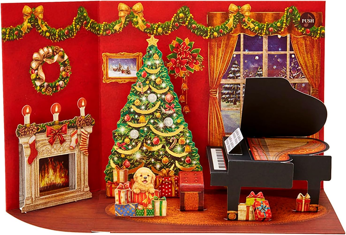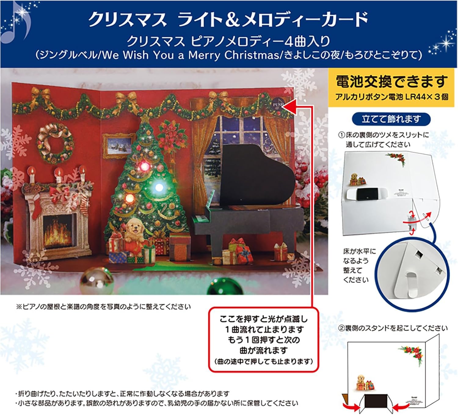 6.1 x 7.9 x 0.4 inches (15.5 x 20 x 1 cm); 3D card like a doll house that will stand up to a Christmas tree or grand piano. The design is detailed and heavy, and has a gorgeous gold foil finish throughout. Press the button to play a piano Christmas melody. Can stand up There is a message space on the back of the card. Replaceable batteries. Illuminated Still Image is an image. Watch the video for sound and light up (The cards in the video are prototype samples and may differ from the actual product. The video includes accessories for photography. Please note that this is not a product. Song: Piano melody 4 songs / Postage fee (domestic) is 140 yen. ©2023 SANRIO CO., LTD.