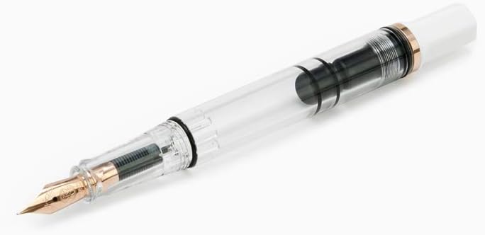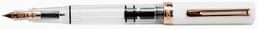 TWSBI ECO White rosegold Fountain pen Rosegold trim and a rosegold-plated steel nib. Pen cap is able to post onto the back of the pen Piston Filler Fountain pen. Simply unscrew the end cap, dip into ink, * back the end cap, and your done! Ready to write!! Pen cap has an inner cap to insure a perfect seal when stored away. Made for the beginner who just wants to try out fountain pens, all the way to the experts. A good everyday worker.