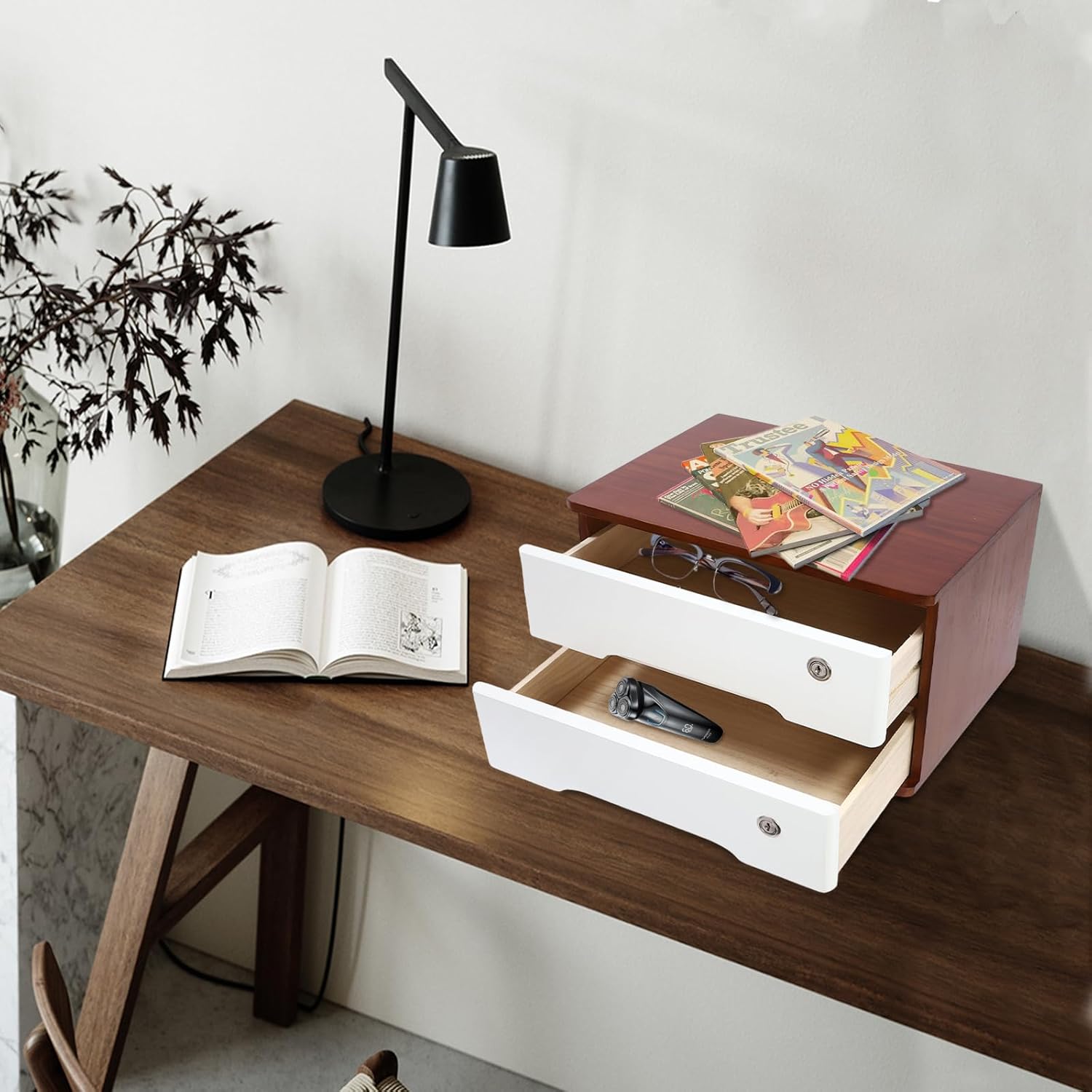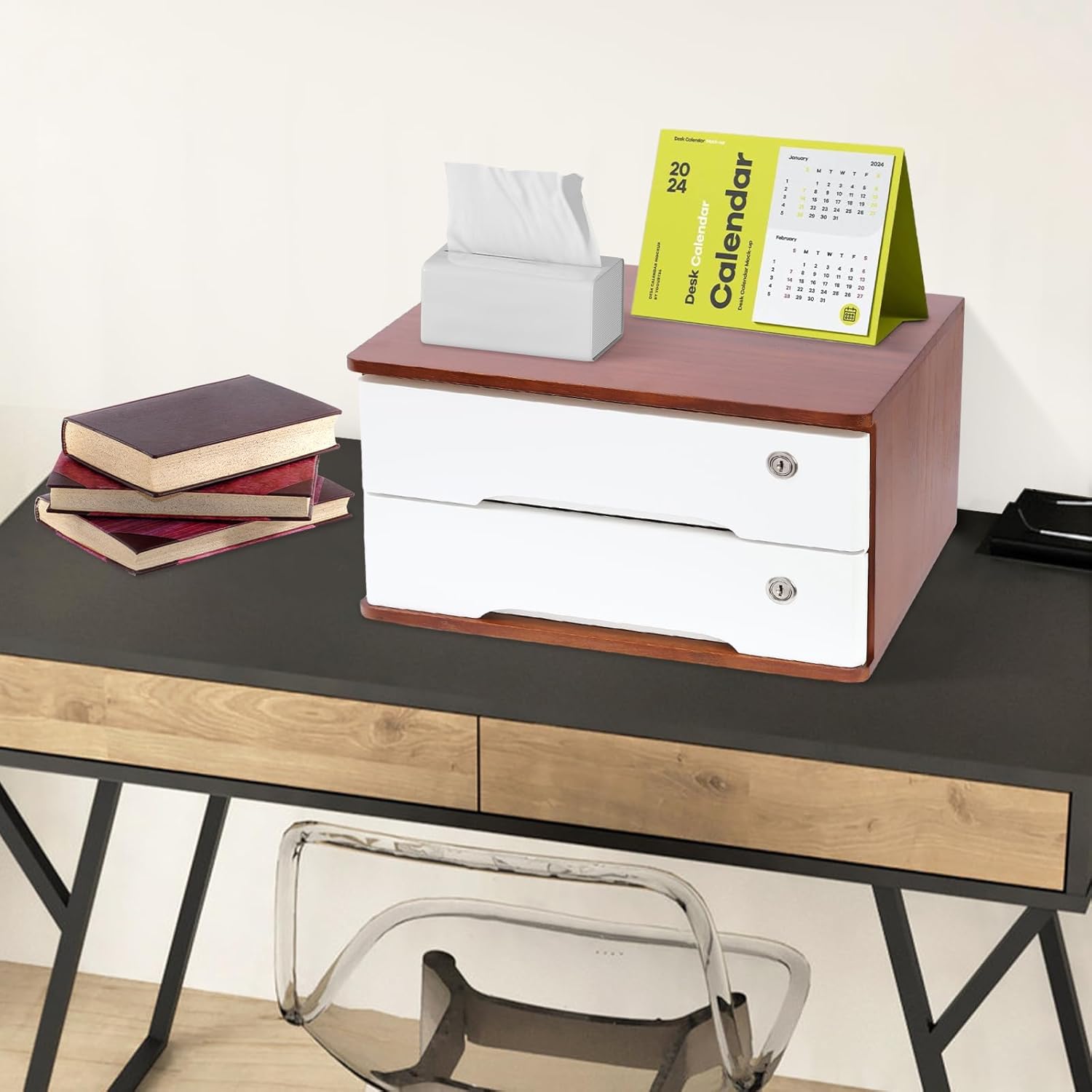 2-Tier Desktop Storage Box with Lockable Drawer, Wooden Desk Organizer for Office Supplies, Flat File Cabinet, Minimalist Design for Home & Office Use(Walnut+White)