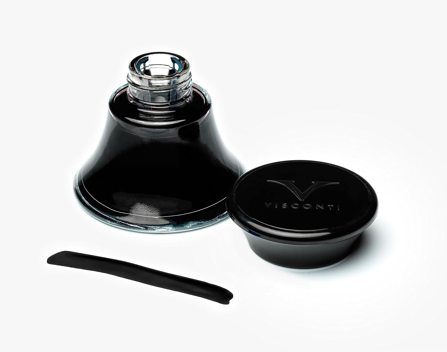 Visconti black glass inkjet 50 ml This new bottle ensures a uniform filling for every single use. Inside, there is a convenient cylinder designed to collect the amount of ink needed for loading even when the product is low, thus avoiding waste. The large cap that reflects the colour of the ink serves as a coating to the Bakelite cap with remarkable heat resistant properties. FEATURES - Line: Ink bottle - Type: Fountain pen - Colour: Black - Purpose: Loading