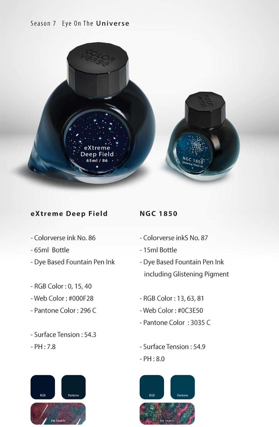 Colorverse Ink, Season 7, Eye on the Universe introduces 12 brilliant colors to the Colorverse collection of inks inspired by space exploration and the uncanny nature of the Expanding Universe. Each set comes with 2 bottles: one 65 ml and on 15 ml. Season 7 also includes 3 new glistening inks in 15 ml bottles. Imported from South Korea.