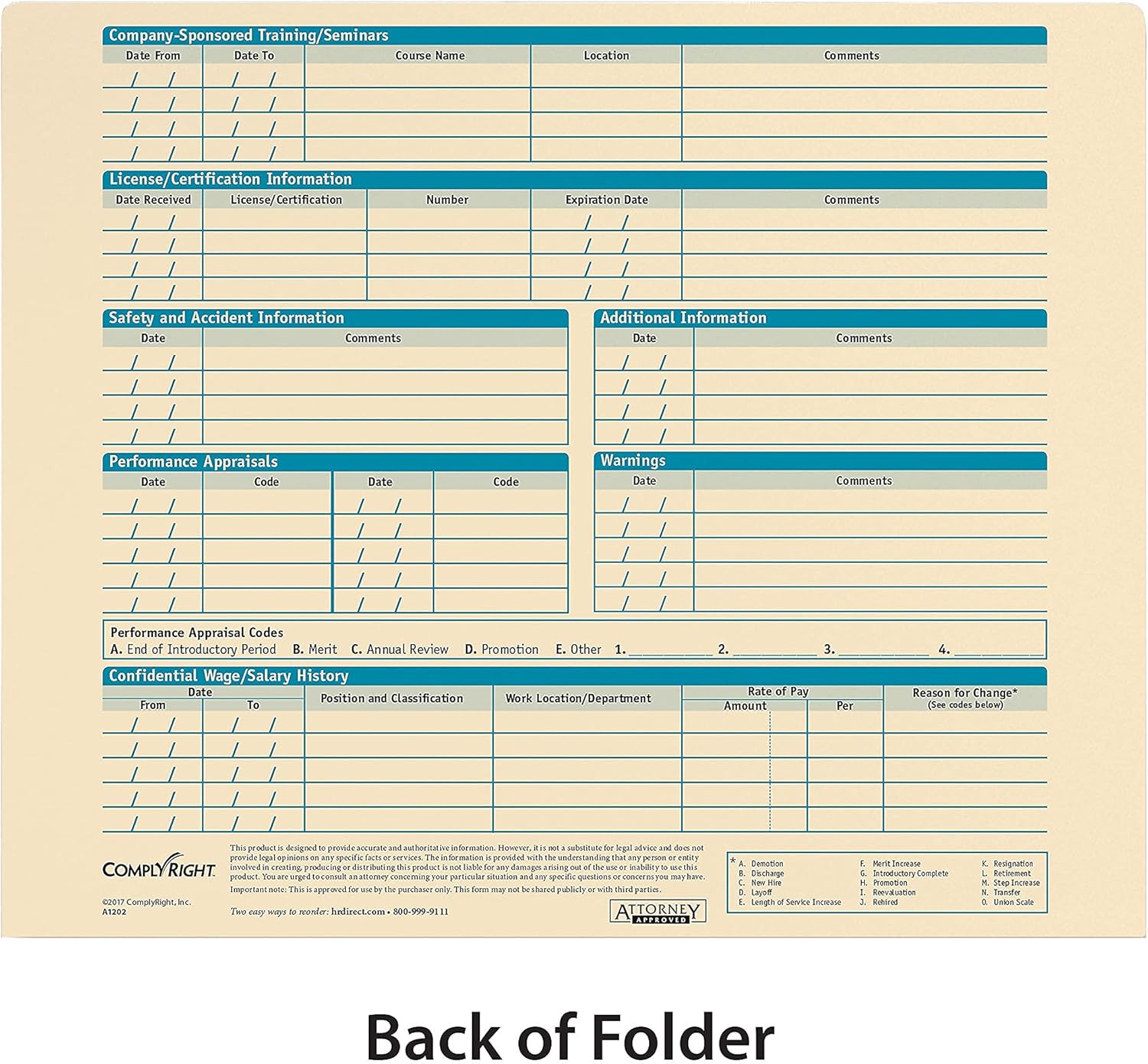 Keep your employee records safe, secure, confidential, and in compliance with federal recordkeeping requirements, with this convenient folder. The ComplyRight Personnel Pocket File Folder complies with state and federal recordkeeping laws and makes it easy to record, store and file important employee data. The content on the outside of the folder captures employee information such as address, employment status, personal information, like SSN and federal withholding, emergency contact information, education information and separation data. Made in the U.S.A of thick, long-lasting manila card stock. Developed by Employment Attorneys for 100% Compliance. Extended tab on folder helps easily locate employee from file cabinets. Easily fits into any filing cabinet or desk drawer. Folder Size: 11.75" x 9.5". Package of 25 folders.