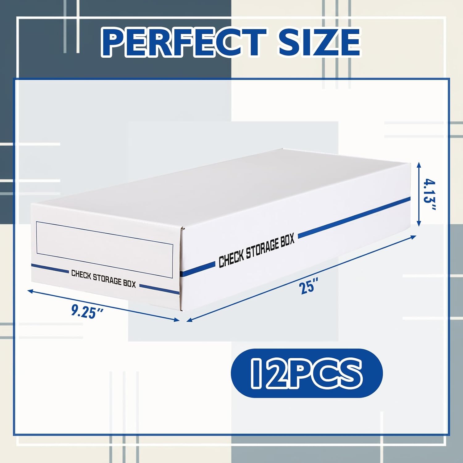 Features: Optimal Filing Organization Our file boxes with lids facilitate optimal document organization. Whether you need to systematize office paperwork or manage home documents, these storage boxes are the efficient solution to tidy up and streamline your filing system. Specifications: Material: Paper Color: white and blue Size: 4.13 X 9.25 x 24inch Package includes: 12 Pack file Check/deposit Slip Storage Box Notes: Manual measurement, please allow slight errors on size. The color may exist a slight difference due to different screen displays