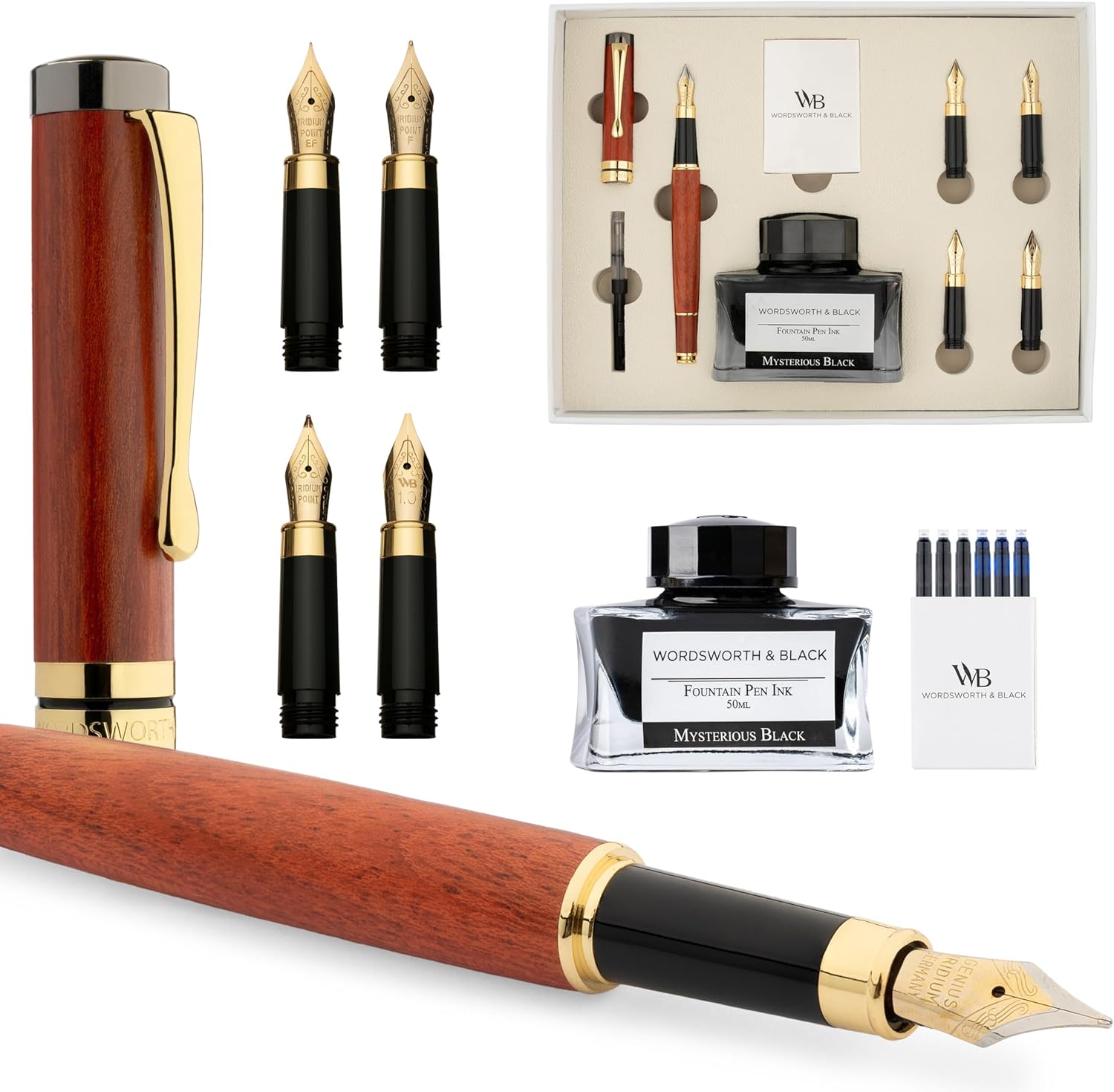 | Included Components | 6 spare ink cartridges (3 black, 3 blue), Ink Bottle,Six Replacement Nibs, Warranty Card and Instructions Booklet, Wordsworth and Black Wood Fountain Pen Ink Converter |