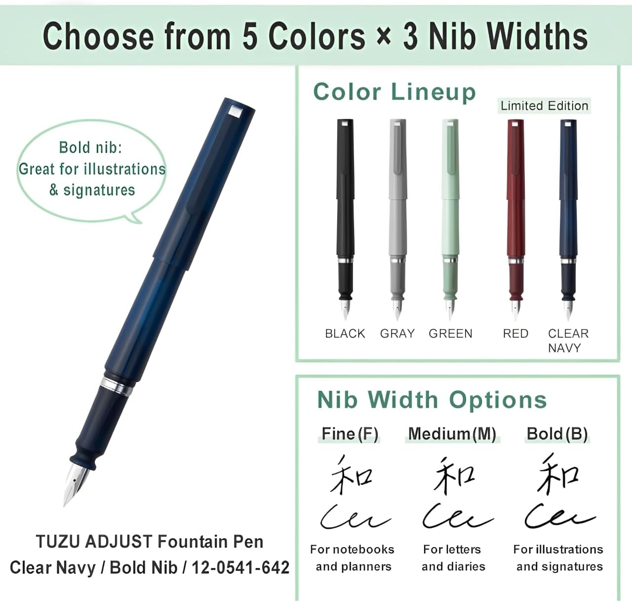 The Sailor TUZU ADJUST Fountain Pen redefines the writing experience with an innovative design that adapts to you. Traditional fountain pens require precise nib positioning for smooth ink flow, making them feel intimidating or difficult for some users. But with TUZU ADJUST, writing feels effortless, natural, and uniquely yours.At the heart of its design is the Rotating Nib feature, allowing fine-tuned adjustments in 10-degree increments. Whether you prefer a steep or relaxed writing angle, the nib adapts to your grip, ensuring consistent ink flow and a seamless writing experience. No matter your hand dominance or writing style, this pen adjusts to match your needs.The Natural Fit Grip enhances comfort and stability. Designed with two smooth surfaces that conform naturally to your fingers, it offers a secure hold with a broader contact area, reducing strain and promoting effortless control. Writing feels intuitive, so you can focus on your thoughts, not your grip.Versatility extends beyond comfort—this pen supports two ink refill options, offering the convenience of disposable cartridges for on-the-go use or the flexibility of a built-in converter for bottled ink refills. Whether you’re jotting notes, writing in a planner, or sketching ideas, the TUZU ADJUST adapts to your workflow.With its minimalist aesthetic, stainless steel nib, and slide-type sealing mechanism, it balances timeless design with modern functionality. The result is a pen that prevents ink from drying out while maintaining smooth, uninterrupted performance.Before you know it, you’re reaching for it every time you write. The TUZU ADJUST Fountain Pen isn’t just a writing instrument—it’s an extension of your creativity, designed to keep up with your unique style, every stroke of the way.Nib: Stainless Steel, B (Bold)Size: 17.5mm x 135mm, Weight: 20gBody Color: Clear NavyIncluded Accessories: 2 Ink Cartridges (Black), 1 Pre-Installed Converter