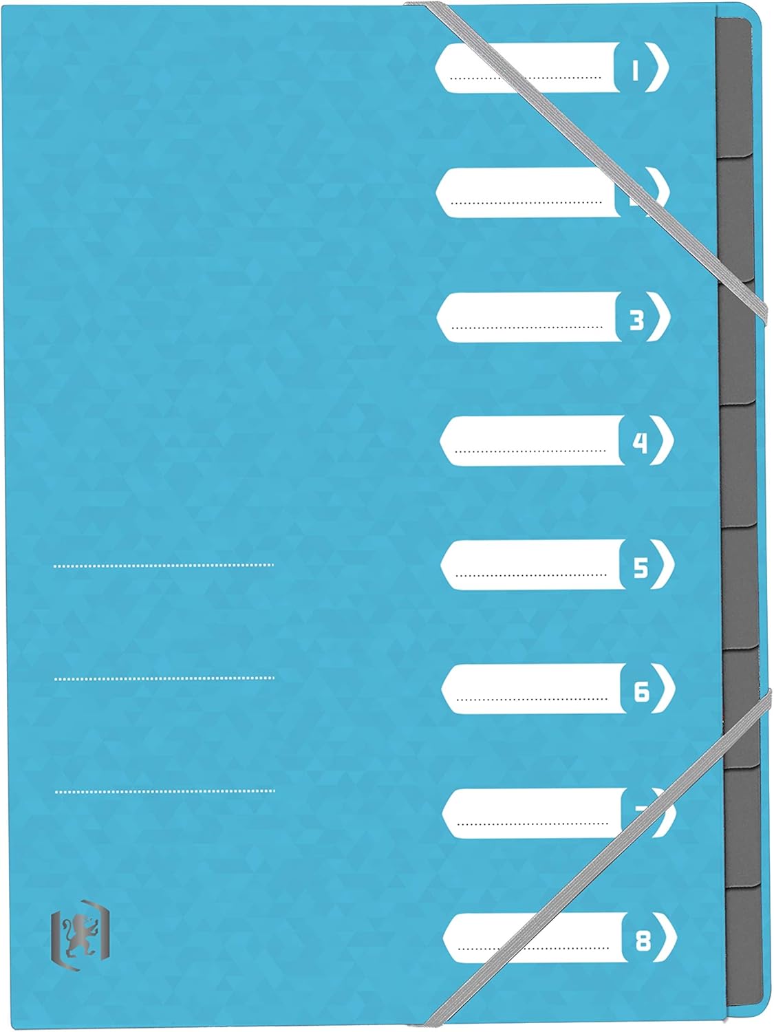 The Oxford top file+ organiser in A4 is made from 390 g/m² cardboard and offers unique durability thanks to the multi-strat technology. The new design is modern and refreshing. There is a printed labelling field for the 8 compartments, which makes organisation easier. Thanks to the closure with flat corner elastic straps, which can be easily closed from back to front, the documents are safely stored. The colour is light blue.