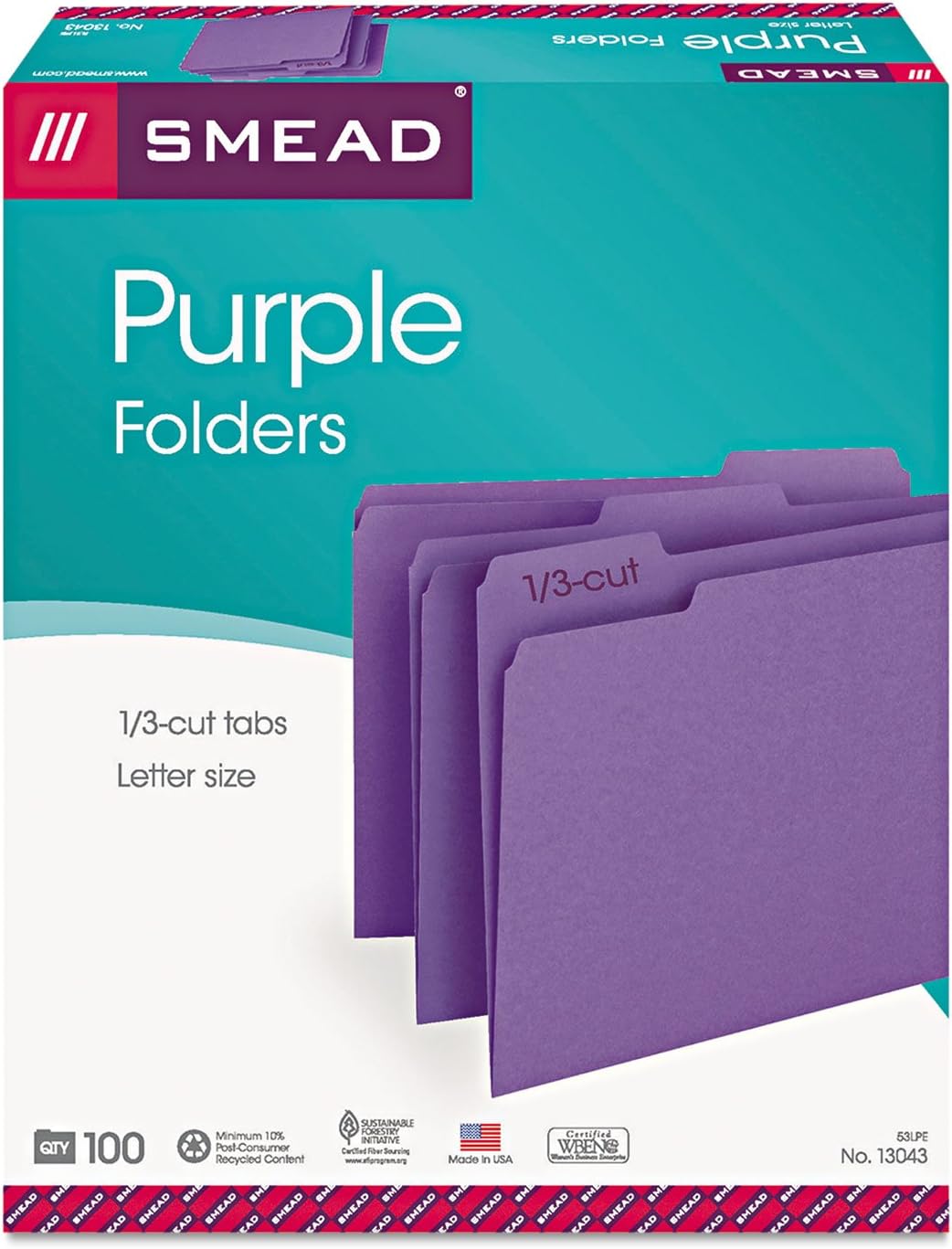 Take advantage of one of the great organization tools--color! Various bright colors make color-coding easy. This product was made using wood sourced from a certified managed forest. File Folder Type: Top Tab; Size: Letter; Folder Material: 11 pt. Stock; Color(s): Purple.