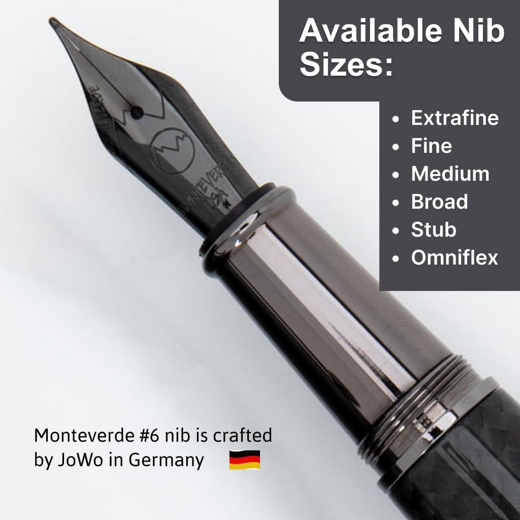Monteverde USA’s Super Mega Carbon Fiber Gunmetal Trim Fountain Pen with an Extra Fine JoWo nib offers a superior writing experience. The durable carbon fiber body is complemented by sleek gunmetal trim, creating a pen that is both stylish and reliable. Refillable with Monteverde standard international G3 ink cartridges or a piston ink converter, this pen is built for convenience and longevity. Packaged in a luxury green gift box, it’s the perfect gift for anyone who values high-quality writing instruments.
