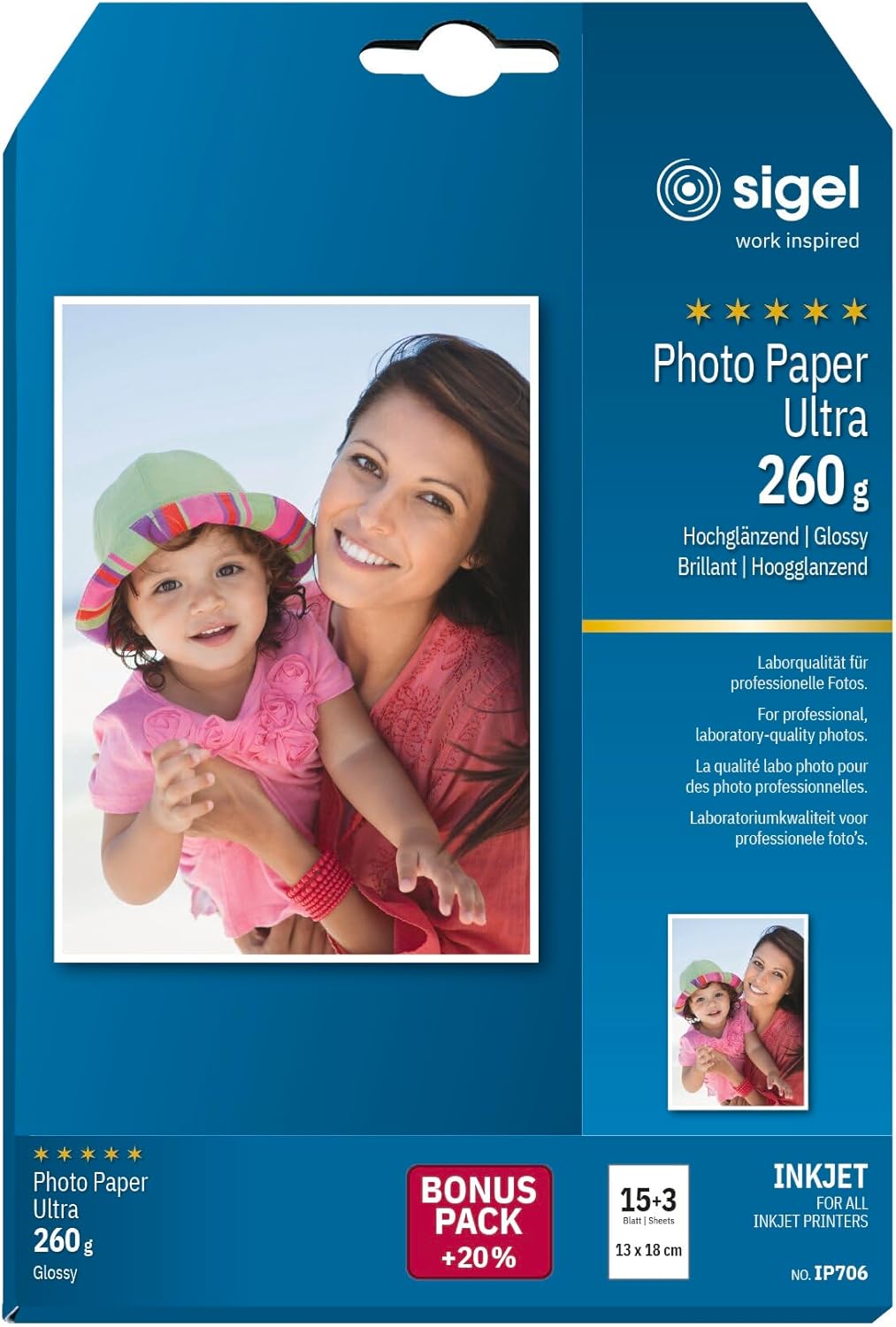 The Ultra inkjet photo papers are ideal for high-quality photos with a resolution of up to 9600 dpi. The glossy coating and high level of UV and light resistance guarantee laboratory-quality prints with rich colours, pin-sharp details and brilliant image quality. Ink is absorbed quickly, which means the photos are instantly dry and smudge-proof. Download the free design software "Enjoy your photo" to get even more out of your prints. Suitable for all standard inkjet printers. Box contents: 50 A4 sheets, 260 gsm.