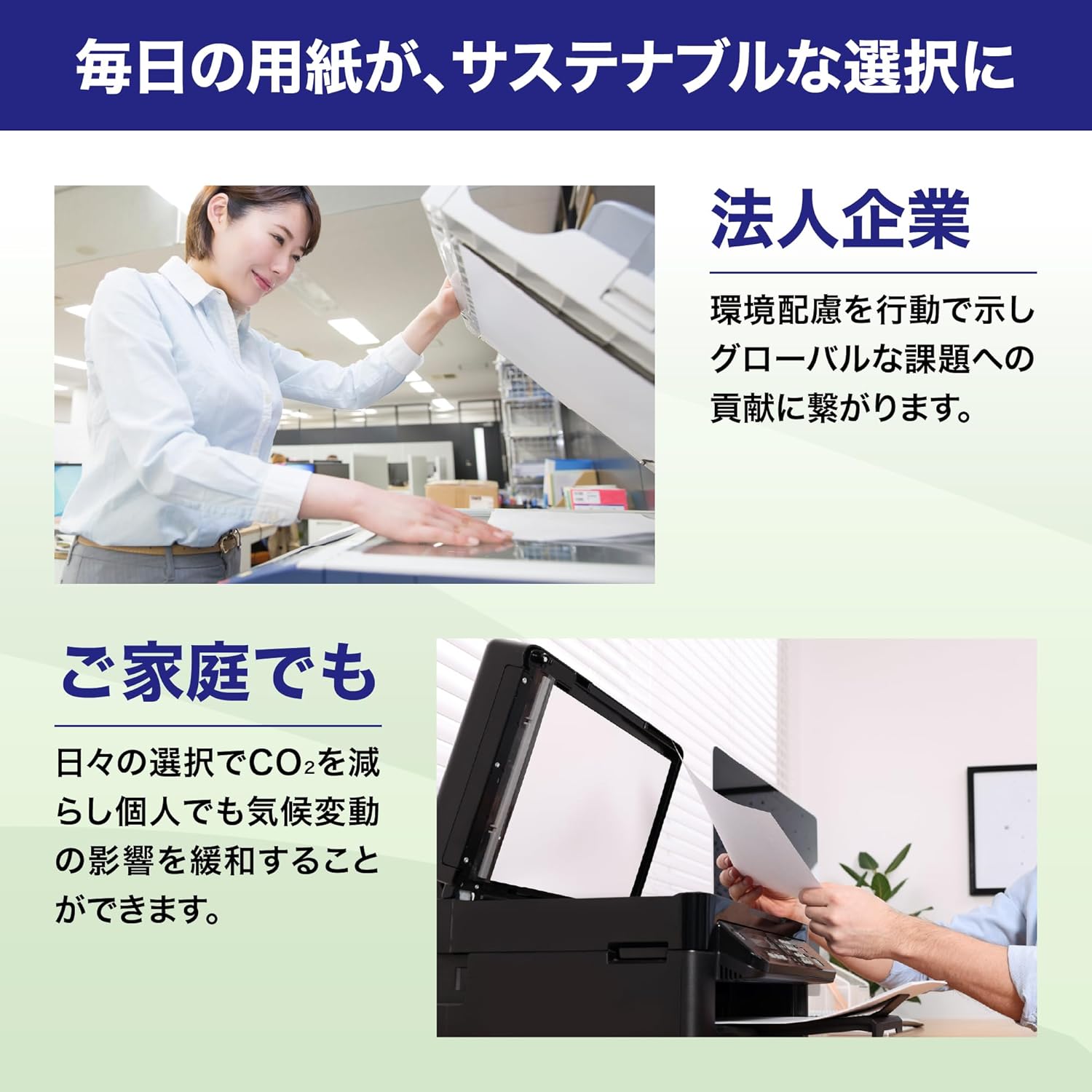 ◆High white copy paper with color printing. ◆Affordable prices that are suitable for large quantities. ◆Simple packaging design. The empty box of each size is a lid type that can be used as a storage box. Compatible with multiple uses such as copiers, laser printers, plain paper faxes, and inkjet printers. The raw materials are made from sustainably managed forests. Made from ECF pulp to reduce environmental burden. ECF stands for "Elemental Chlorine Free" Chlorine is free of chlorine in the pulp as the raw material, and it has a significant reduction in the production of harmful substances such as chloroform and dioxin.