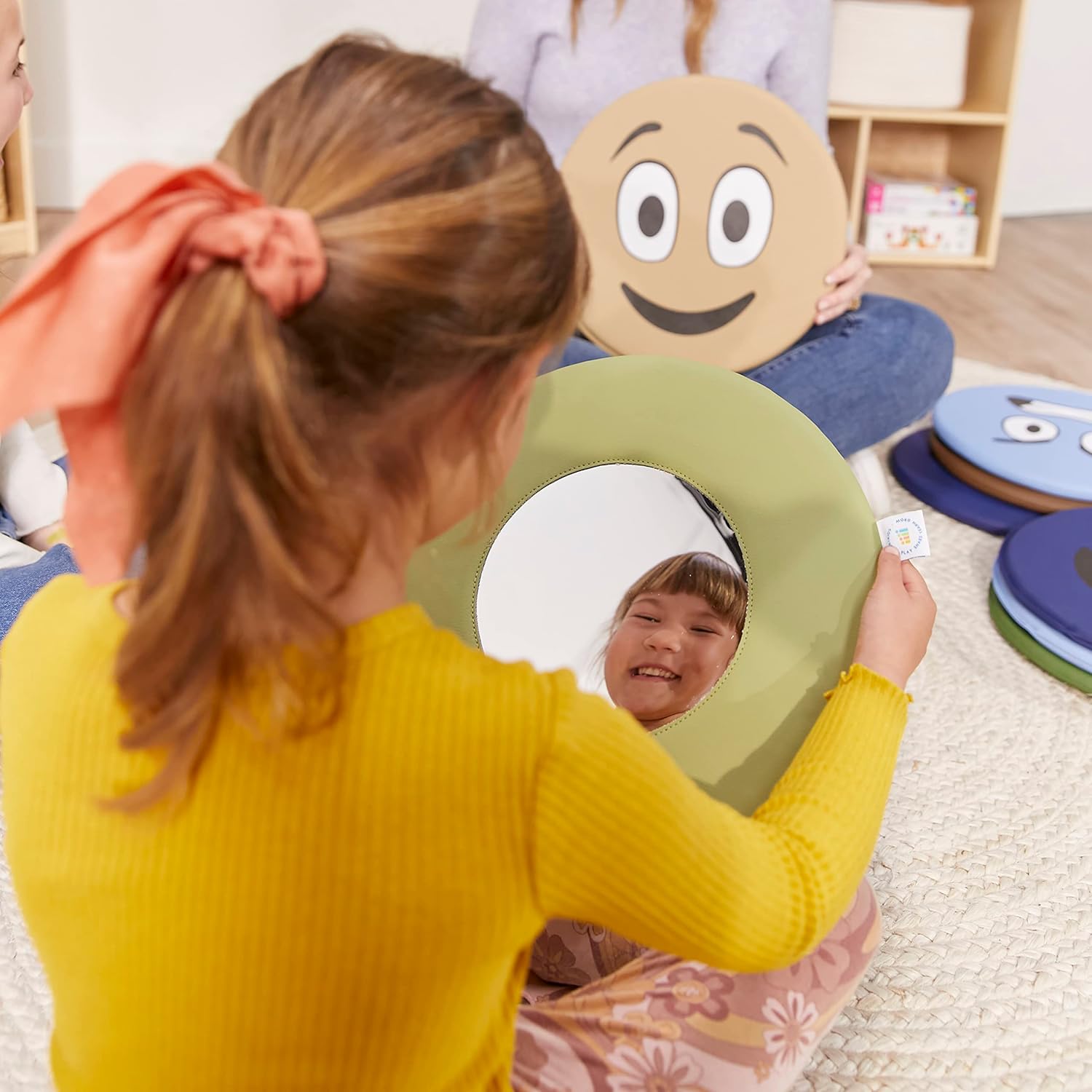 Help little ones strengthen expressive language with ECR4Kids SoftZone Emotion Pads and Mirror. This colorful 8-piece flexible seating set doubles as an interactive educational tool to help parents, teachers, and caregivers introduce basic emotions. Teaching primary emotions to children in a classroom, daycare or home is essential as it helps them understand and communicate their feelings effectively. Learning about emotions can also help expand a child's vocabulary. This hands-on activity set encourages students to explore and engage in discussions and express themselves in a supportive environment. Kids who learn about emotions at an early age are more likely to develop strong social and emotional skills, which can have a positive impact on their academic and personal lives. It helps them to better understand their feelings, allowing them to cultivate stronger relationships as they grow while learning to recognize their emotions and communicate in a healthy and positive way. The foam core is covered with water-resistant polyurethane vegan leather with a durable woven backing. Fully stitched seams and soft edges make this set safe for children. Complete the set and store it in the Mobile Cushion Cart ELR-12299; sold separately.