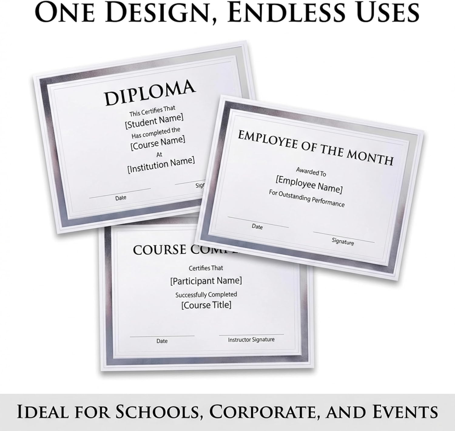 | Material Features | Color: Bright white base enhances contrast and readability for printed text and graphics, Edge Quality: Clean-cut edges ensure smooth feeding through printers and a polished final look, Embossing: Raised foil elements provide tactile elegance and visual depth, Finish: Smooth surface optimized for crisp printing and professional presentation, Foil Detailing: Double foil inner border adds a premium, embossed look with metallic shine, Paper Weight: Made from durable 38lb white paper stock, offering a substantial feel without bulk, Presentation Ready: Pairs beautifully with foil seals and Certificate Jackets for a complete award experience, Printer Compatibility: Works seamlessly with both laser and inkjet printers—no smudging or feathering, Size: Standard 8½" x 11" format fits most certificate frames and presentation folders. |