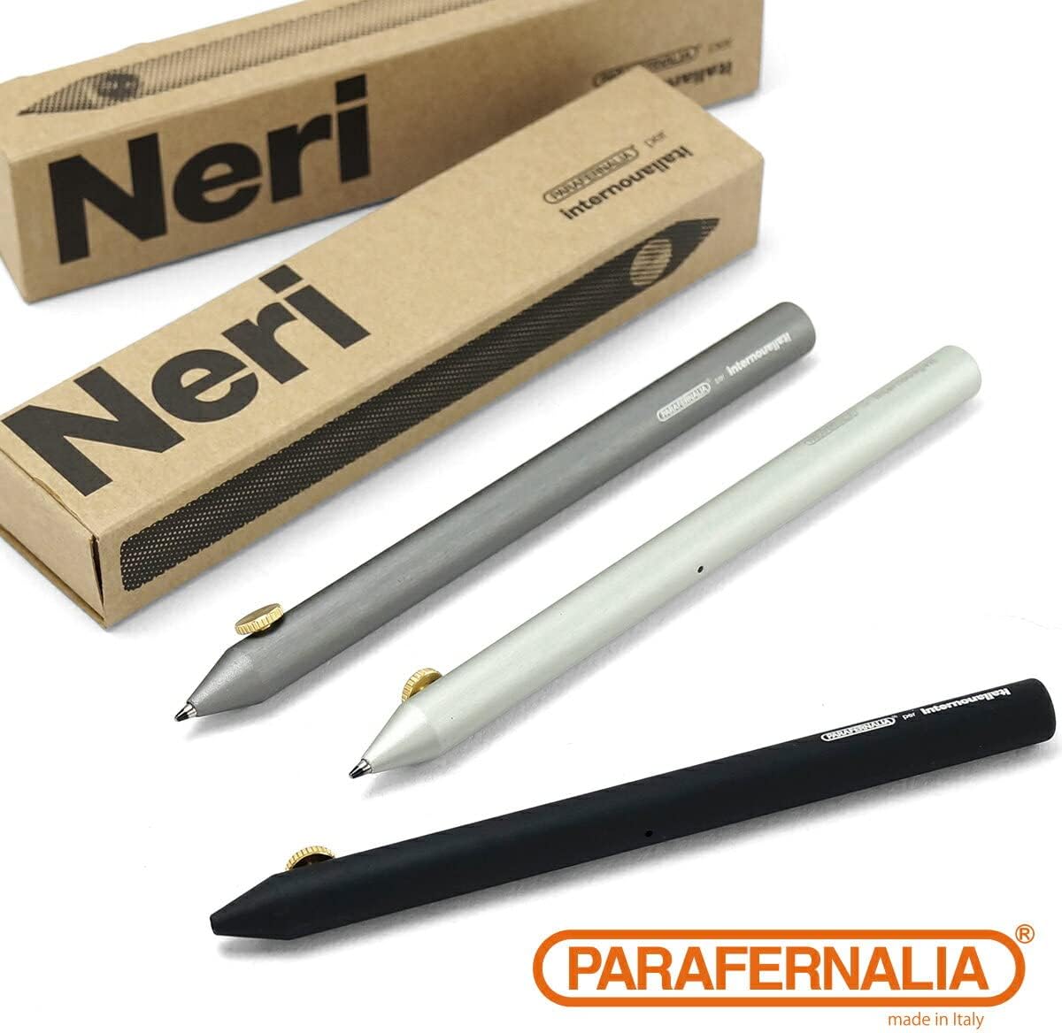 Parafernalia presents neri, a family of pens and Mechanical pencils designed by giulio iacchetti, made of anodized Aluminum. Neri is an exercise in absolute minimalism for design junkies and aficionados of writing. Neri Falls outside the usual automatic opening/closing systems and the classic cap. Indeed, the placement of the leads and ability to regulate their length - and also that of the pen refills, a highly unique feature - is done by simply turning the contrasting brass thumbscrew, a technique derived from the gesture for adjusting the points of compasses used in technical drawing. The neri is available in three distinct colors: black, Aluminum and titanium, in both ballpoint and 5.6mm Pencil.