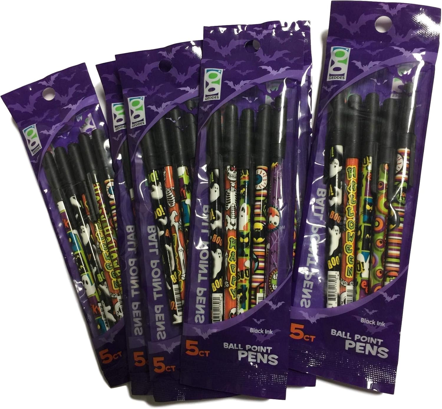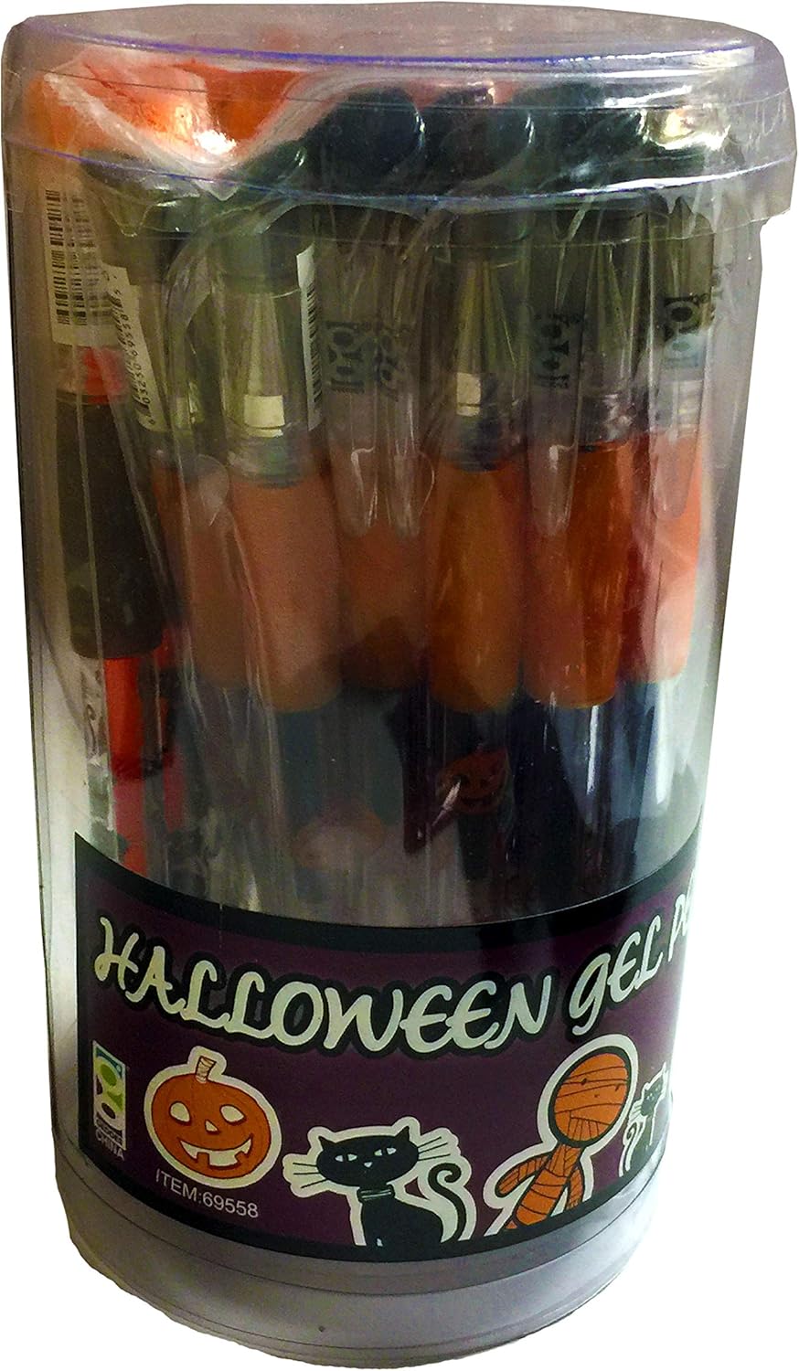 Tub of 24 Gel Pens with 4 designs and black and orange ink options; 6 bags of 35 mini-erasers; 6 bags of 7ct #2 pencils; 6 bags of 5ct stick pens in black ink.
