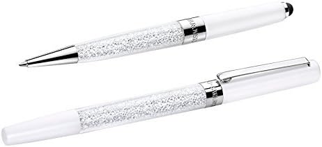 Write or use a smart device in style with this elegant pen set. It includes a Swarovski stylus ballpoint pen and our newly-designed rollerball pen, with its removable cap with a clip. Both shine in white lacquered metal and sparkle with over 1,000 clear crystals. A great gift idea, this set blends functionality and elegance. It comes in a box and ink refills are available to purchase. Size: 5 5/8 x 3/8 inches Article no.: 5213608