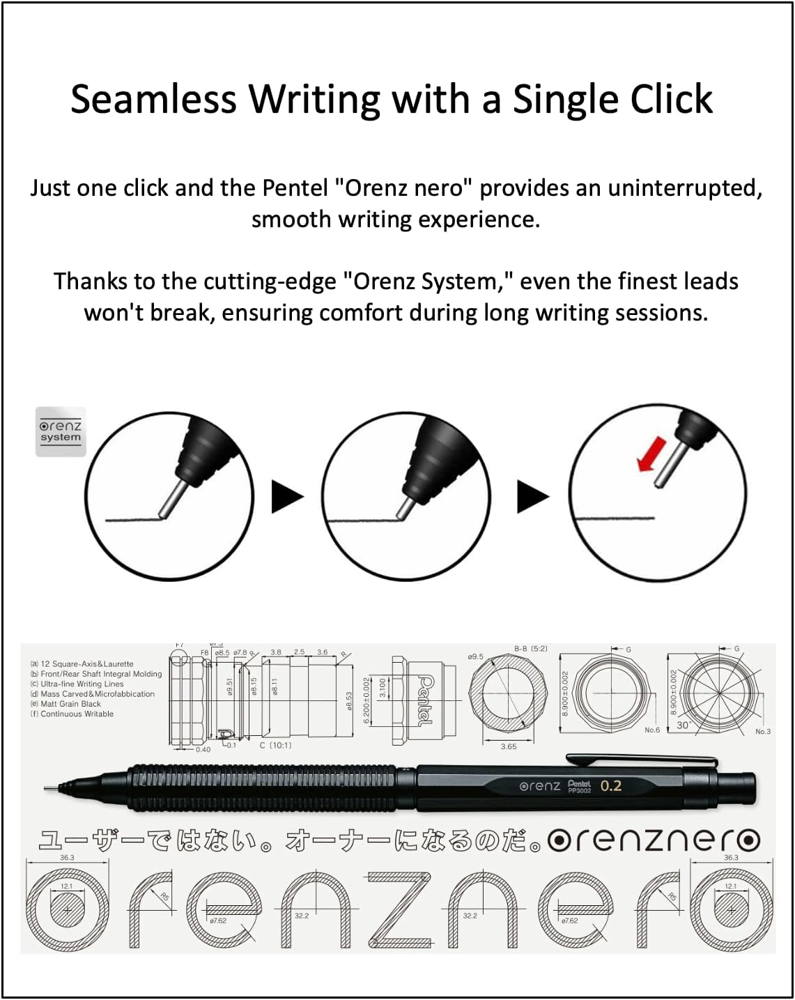 Orenz nero 0.2 HB Black Body + Ain 0.2 HB leads, qullity original Black slim pen case