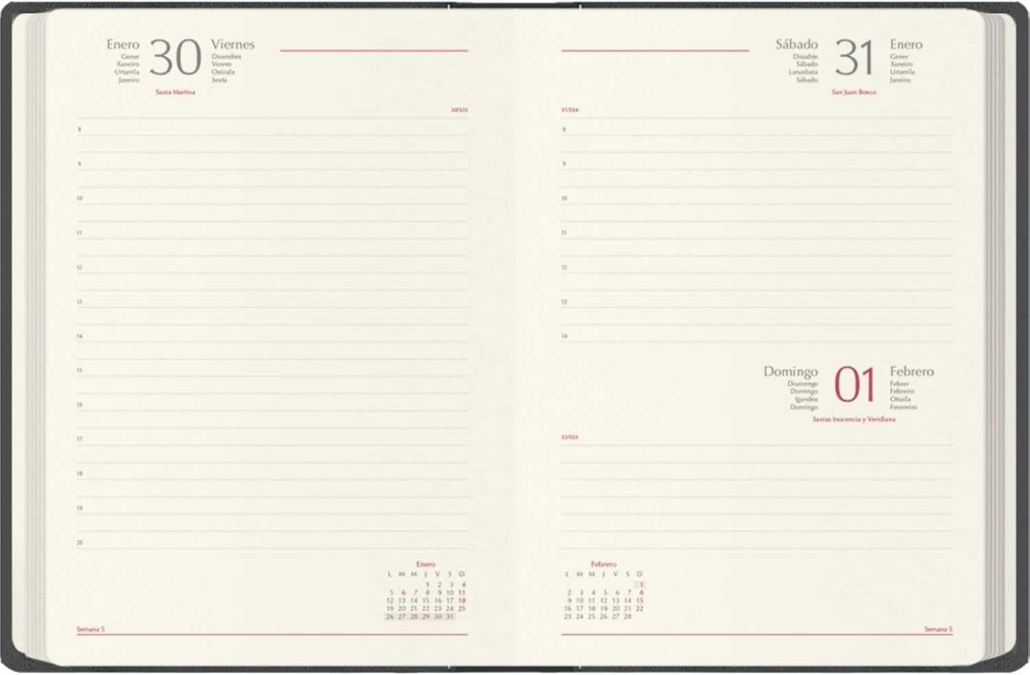 Organize your 2026 with the DOHE Melbourne diary, a Spanish year planner designed for those looking for functionality, style and comfort in one product. With 336 pages from January to December, it's the perfect planner for meetings, travel, daily tasks, or personal use. The day-by-page format provides ample and detailed space for each day, allowing you to accurately note your appointments, reminders, and goals. Saturday and Sunday share a page to optimize the space without losing clarity. With a size of A5 (15 x 21 cm), it combines portability and enough space for comfortable writing. Easily fits in purses or backpacks, ideal for professionals and students on the go. This diary is 100% equipped: the hard cardboard cover with soft blue faux leather ensures a premium feel and durability. The elastic closure ensures that all contents are protected. In addition, it includes a handy rubberized side pen holder to keep your favorite pen close at hand, and a stylish brown bookmark for quick access to the page you need. In addition, it has useful sections such as personal data, 2025-2027 calendars, plans, international prefixes, notes, contacts, and a tracking of elapsed and remaining days to help you stay in full control of your year. Make 2026 an organized and stylish year with the DOHE Melbourne appointment planner: premium functionality within reach.