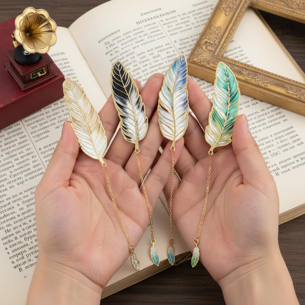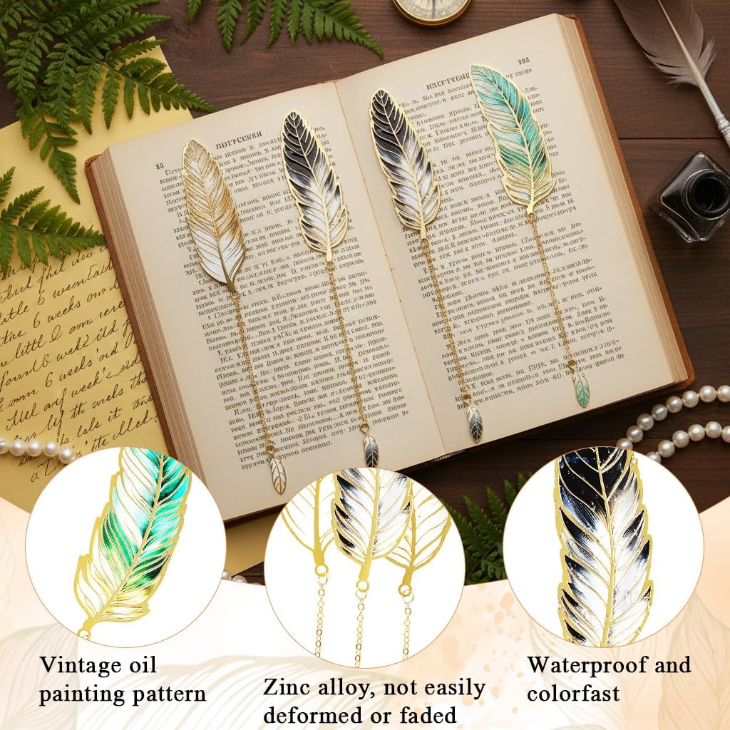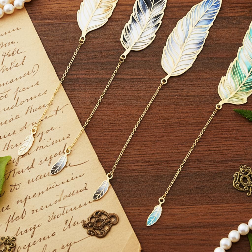 4Pcs Vintage Feather Bookmarks Gradient Color Metal Feather Bookmarks with Pendant Mini Feather