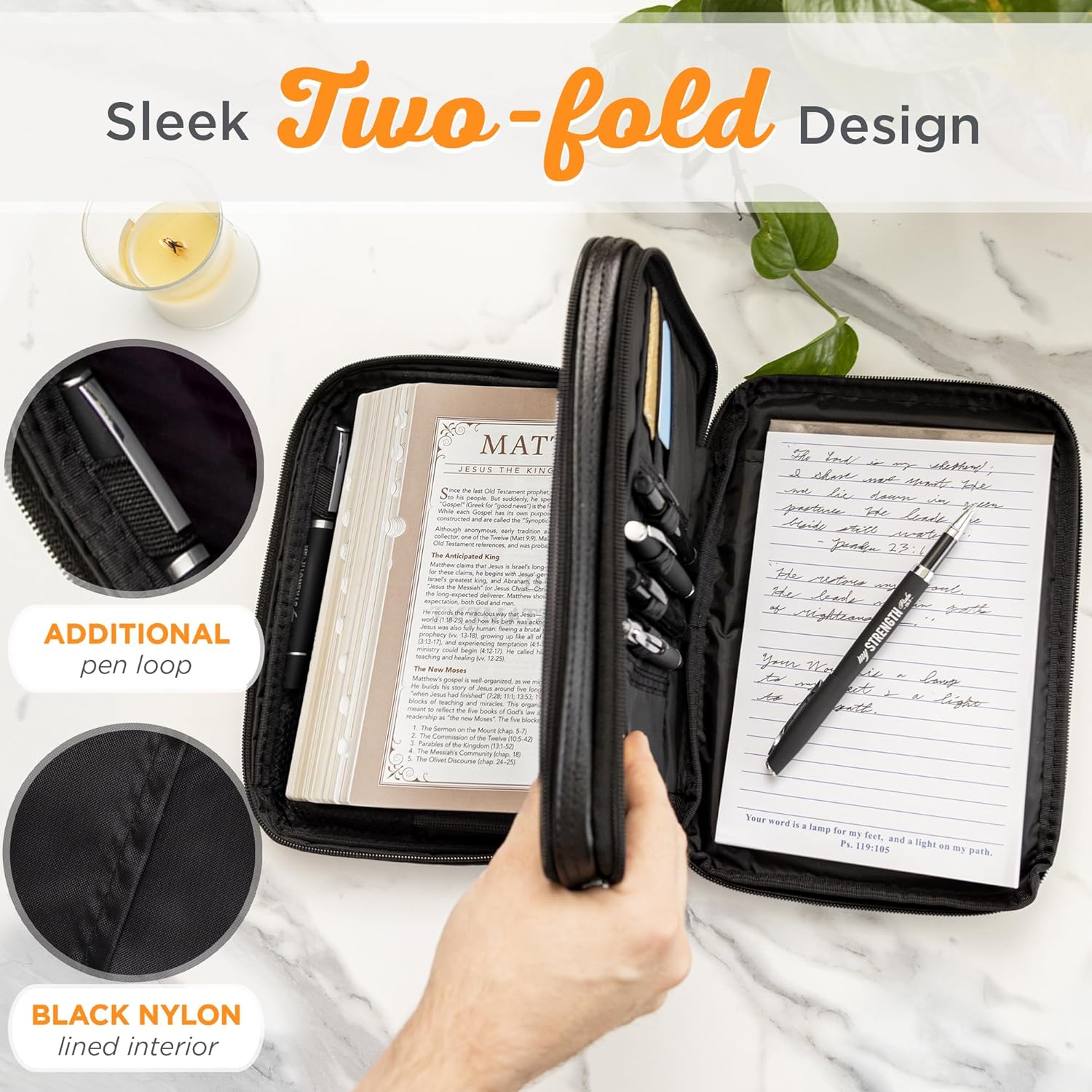 The Two-fold Black Faux Leather Organizer Bible Cover is the perfect Bible cover and organizer for any man or woman who likes to approach their Bible study in an orderly way. The front panel of the black faux leather cover is divided into three panels, each with double row topstitching for durability and decoration. A silver oval badge is placed in the center of the bottom panel and is engraved with the traditional Ichthus fish emblem. Coordinating silver hardware secures the faux leather handle. Two zippered compartments provide plenty of space for your Bible, a notebook, pens, paper, and more. The first compartment has a slip pocket to secure an included notepad. On the opposite panel, you will find another slip pocket for loose paper, three credit card holder slots, 4 pen loops, and an included highlighter. The second compartment has two pockets to securely hold the covers of your Bible, a zipped mesh pocket, and an additional pen loop. Both compartments close with zippers, and two silver cross engraved zipper pulls keep contents secure. This Bible cover is available in six sizes: extra small, small, thinline small, medium, large, and extra-large. Extra Large Cover fits books and Bibles no larger than: 10.2" x 7.5" x 2" (259 x 191 x 51mm) Large Cover fits books and Bibles no larger than: 9" x 6.6" x 1.8" (229 x 168 x 46mm) Medium Cover fits books and Bibles no larger than: 8.8" x 6.1" x 1.7" (224 x 155 x 43mm) Small Cover fits books and Bibles no larger than: 8.1 x 5.5 x 1.5 (206 x 140 x 38mm) Small Thinline Cover fits books and Bibles no larger than: 8.1" x 5.2" x 1.1" (206 x 132 x 28mm) Extra Small Cover fits books and Bibles no larger than: 6" x 4.5" x 1.4" (152 x 114 x 36mm)