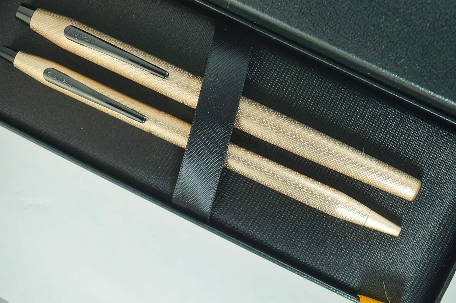 An attractive PVD Rose finished barrel and matching appointments mark the Century this selectip Rollerball and Ballpoint Pen set.This is a very rare combo set that can be found in very few hands with taste for quality.This is a precious object that writes. The set perfectly combines the art of the jeweler with the most advanced technology to be found in a modern writing instrument. An Icon of American Design and Innovation Perhaps our most well-known pen, the Classic Century has been an icon of American design and innovation since 1946. Classic Century symbolizes the spirit of entrepreneurship and the will to succeed. The iconic slim Cross silhouette finished in brushed rose-gold PVD with a diamond patterned engraving and polished black PVD appointments Click off cap and smooth black writing grip Includes one medium, black rollerball tip in pen (refill #8523) Presented in a premium gift box Covered by a Lifetime Mechanical Refined lines and more iconic Cross silhouette Click-on cap with the classic Cross conical-top profile. Wherever entrepreneurship lives, when a vision comes to life, when teamwork builds something great , when an idea is born, plans made, or verse perfected, the essence of Cross today lies in the doing. In seeking and finding, in self expression, in the journey of success that is unique to each individual.