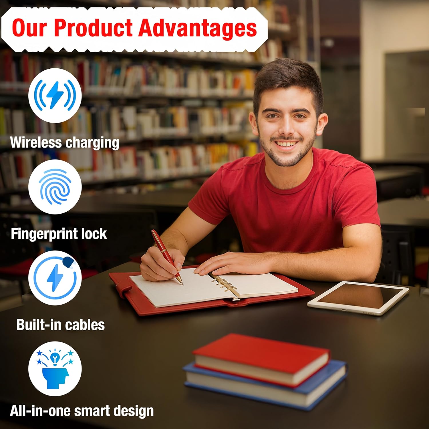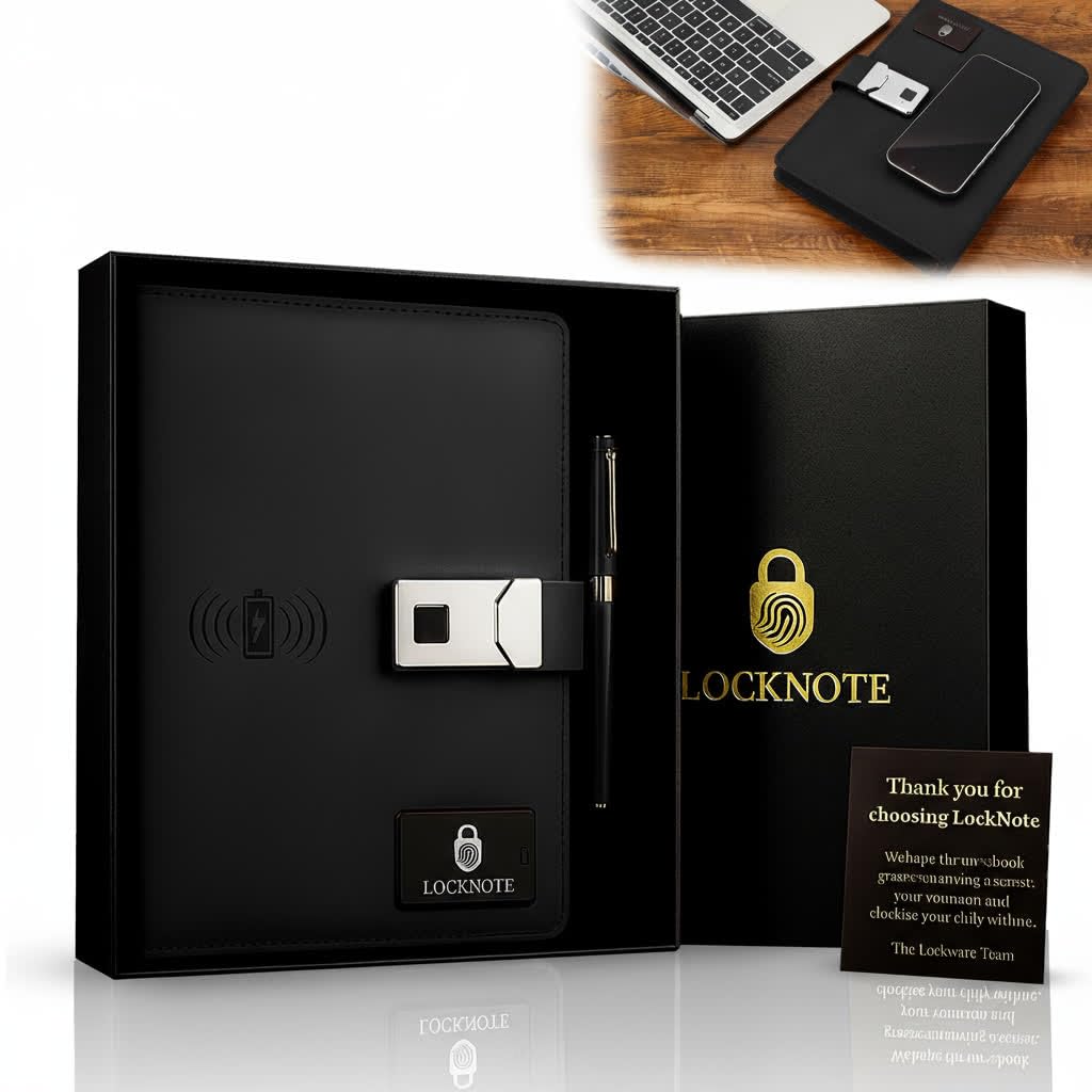 LockNote A5 leather business notebook and portfolio binder with fingerprint lock and built in power bank High quality PU leather organizer designed for professionals and students combines style and advanced functionality with wireless charging 8000mAh power bank biometric fingerprint security lock A5 binder clipboard multiple card holders phone slot pen loop and folders includes elegant gift box perfect as business notebook leather notebook diary with lock or organizer notebook for school office travel and work Read more