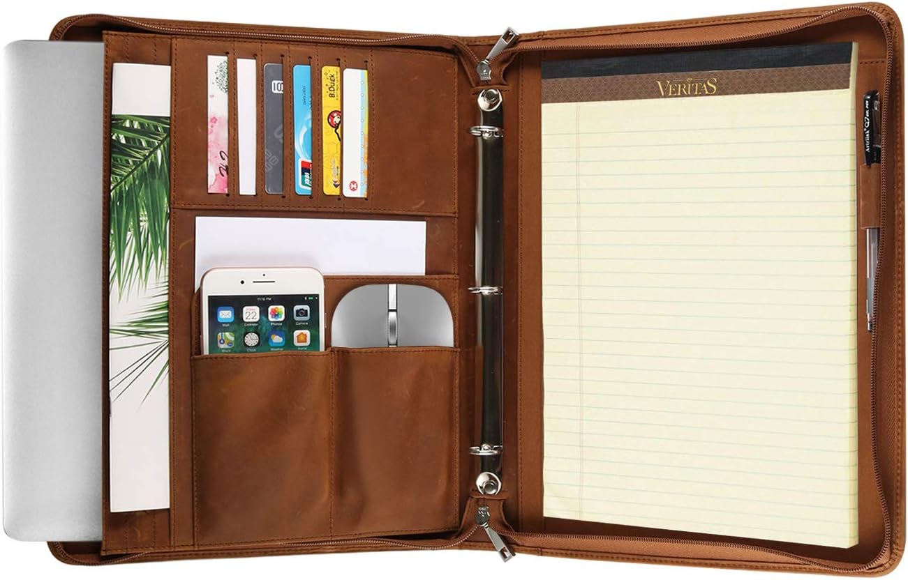 Deluxe Business casual can look cool and laid-back without crossing outside the boundaries of work-appropriate. This padfolio pulls together everything you need in a single, easy-to-carry package. after absorbing your hand oil, getting tiny scratches and rugs from daily uses, the antique look of the padfolio will add more uniqueness over time. Left size laptop sleeve fits up to 13.5-inch laptop/tablet, hand panel organizes your business cards, pen/marker holders,mouse,mobile phone pocket (5.5 x 3.9 inch,fits up to 6.0" phone),1 Zippered pocket. Features a flexible 3-ring binder that can hold 0.7 inch Loose-Leaf Refills (the product does not come with paper refills). Perhaps you are the manager of the business, or just start your career, and the organizer's combination will provide more help in your presentations and meetings or interviews to continue the interview and discussion.