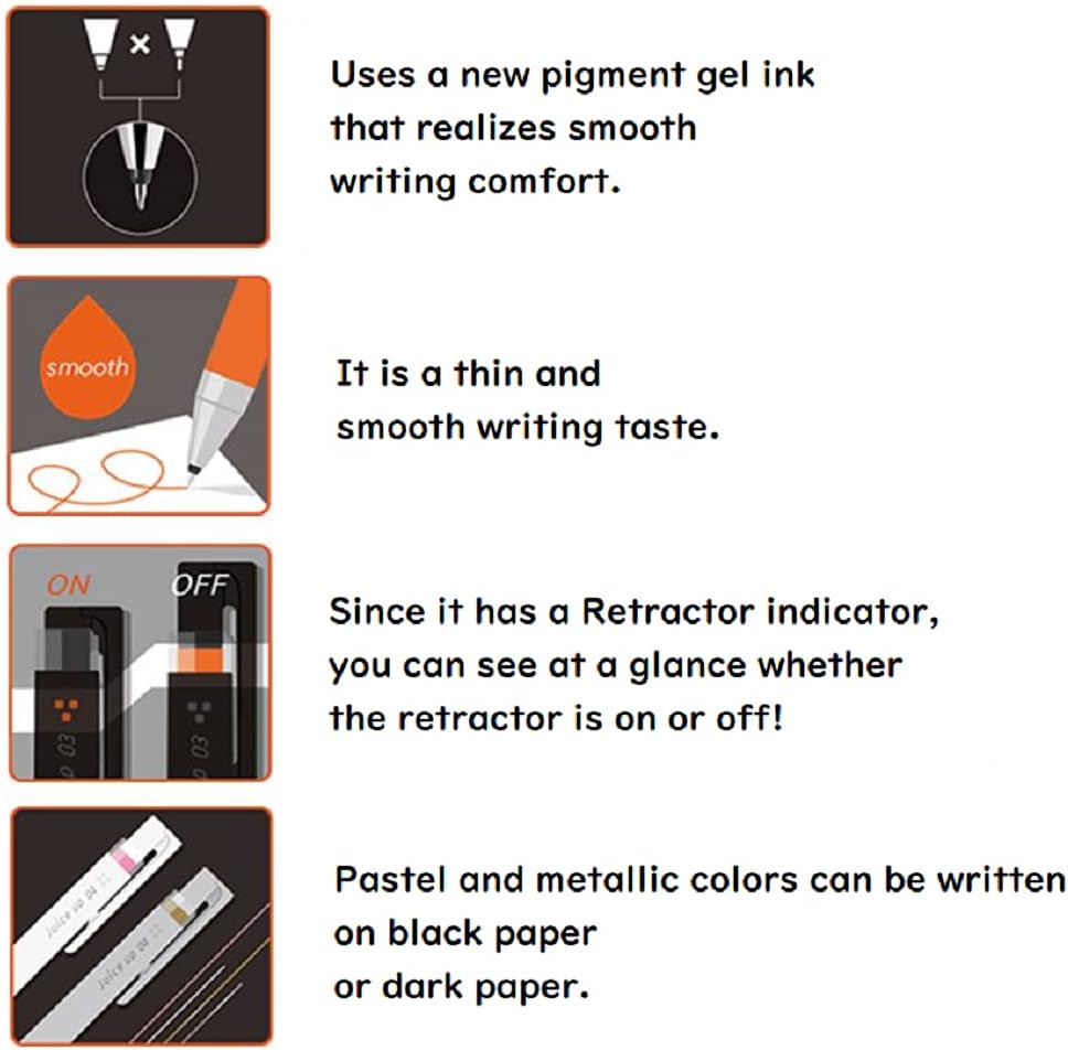 "Juice Up" is a higher-grade colorful ultra-fine gel ink ballpoint pen that realizes a new sense of deep and smooth writing comfort. Since it has a Retractor indicator, you can see at a glance whether the retractor is on or off ! Pastel and metallic colors can be written on black paper or dark paper. Size : Maximum diameter φ 0.41 in, total length 5.62 in Pen tip : 0.4 mm (ultra-fine) Method : Retractable Ink : Water-based pigment gel ink. The solid black with elegant Pink Gold-accented tip and clip looks luxurious. Sensitive Rubber Tip is designed for use with most touch screen devices. I also works as a cushion when retracting or extending the tip. Beautiful looking Blue Black ink.