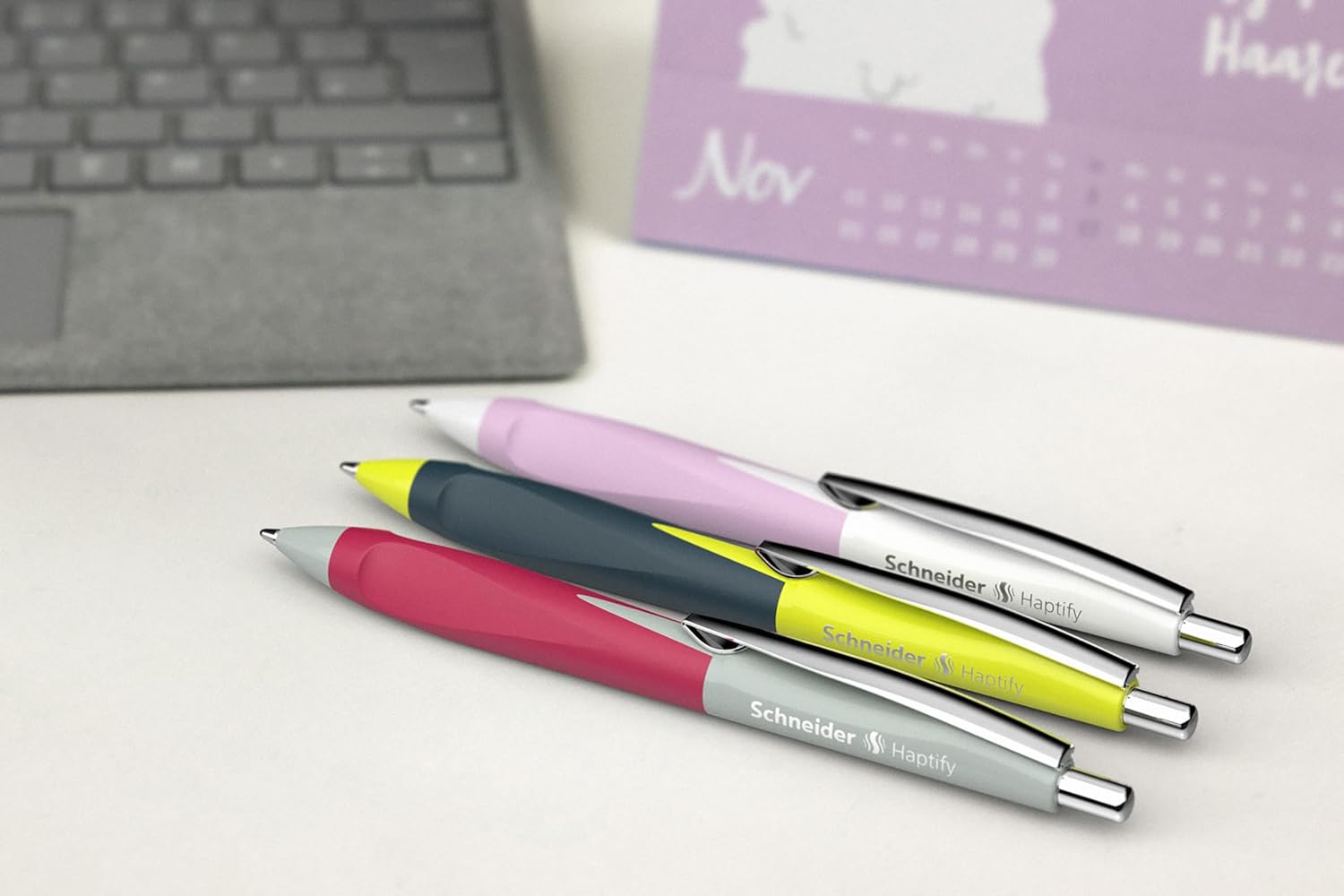 Ballpoint pen with ergonomic rubberised three-surface handle for an ideal hold of the hand. The replaceable metal refill Express 775 Medium (M) ensures a pleasantly soft writing experience. Ink colour: blue, indelible according to ISO 12757-2. The wear-resistant stainless steel tip guarantees that the large paste supply can be used completely and without smearing. The Haptify has a sturdy metal clip and is refillable with different lead formats thanks to the clever Plug+Play system.