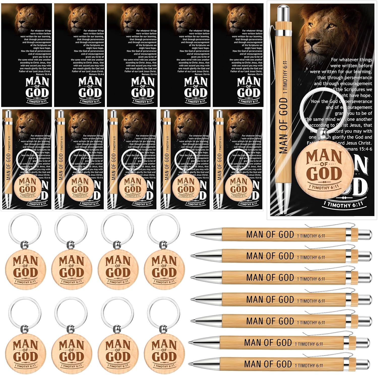 Features: With the Opp bags measuring about 3.54 x 7.87 inches, these Christian men gifts provide convenient portability. Whether at home or church, this gift set can be easily carried or stored, enabling you to express your appreciation at any time. Not just a symbolic gesture, the Christian gifts for men have practical usefulness, offering a pen to inscribe thoughts or sermons, a keychain for homely or church keys, and an inspirational card that can be cherished forever. Specifications: Main material: Ballpoint pen: bamboo Keychain: beech wood Card: 250g coated paper Color: multicolor Size: Ballpoint pen: about 5.43 inches/ 13.8 cm long Cards: about 3.35 x 6.69 inches/ 8.5 x 17 cm Keychain: about 1.26 x 2.09 inches/ 3.2 x 5.3 cm, 1.18 inches/ 3 cm in key ring diameter Opp bags: about 3.54 x 7.87 inches/ 9 x 20 cm Package includes: 40 x Bible verse ballpoint pens 40 x Wooden man of god keychains 40 x Religious gift cards 40 x Opp bags Notes: Manual measurement, please allow slight errors on size. The color may exist a slight difference due to different screen displays. Please note that our products are suitable for ages 14+.