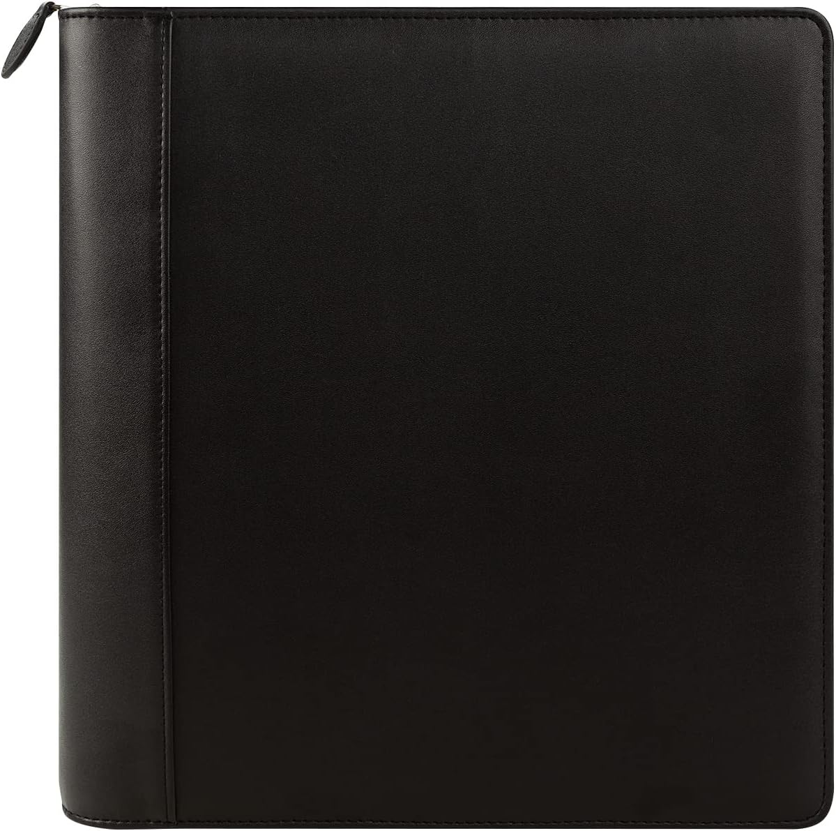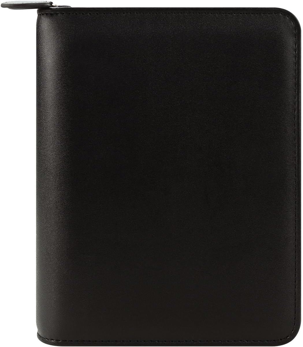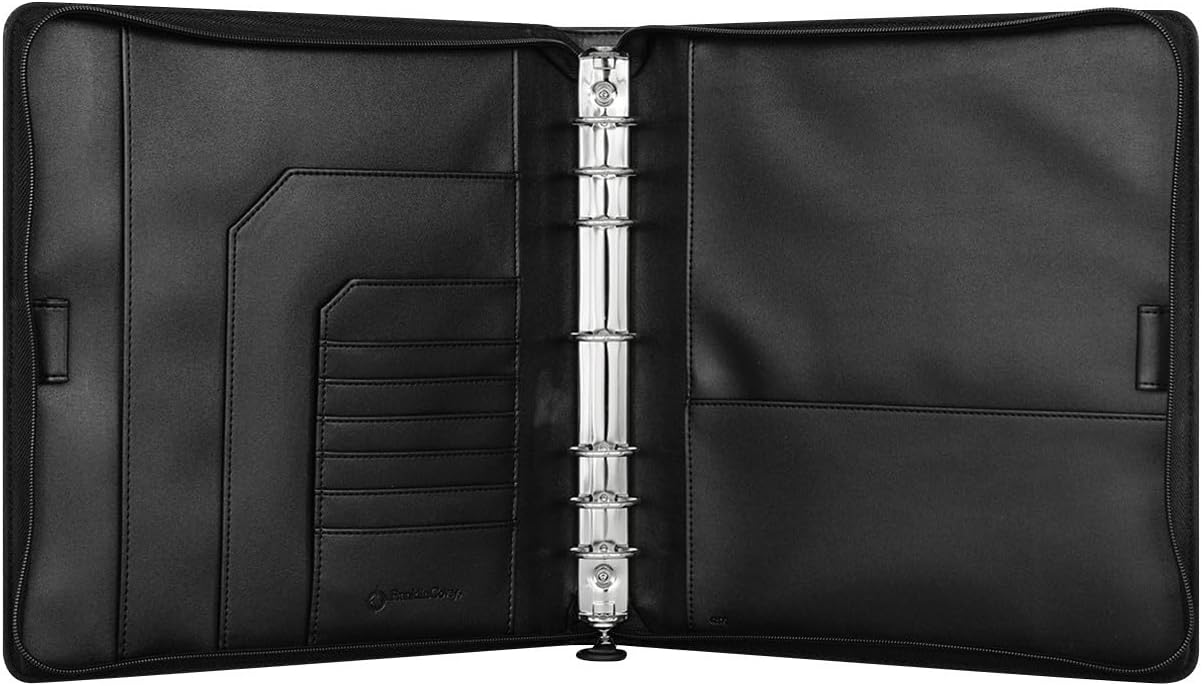 The beautiful simulated leather wipes clean easily and offers plenty of storage with business/credit card pockets, vertical pocket and two secretary pockets and two pen loops. The zipper closure keeps it all under wraps. Includes two pagelifters.