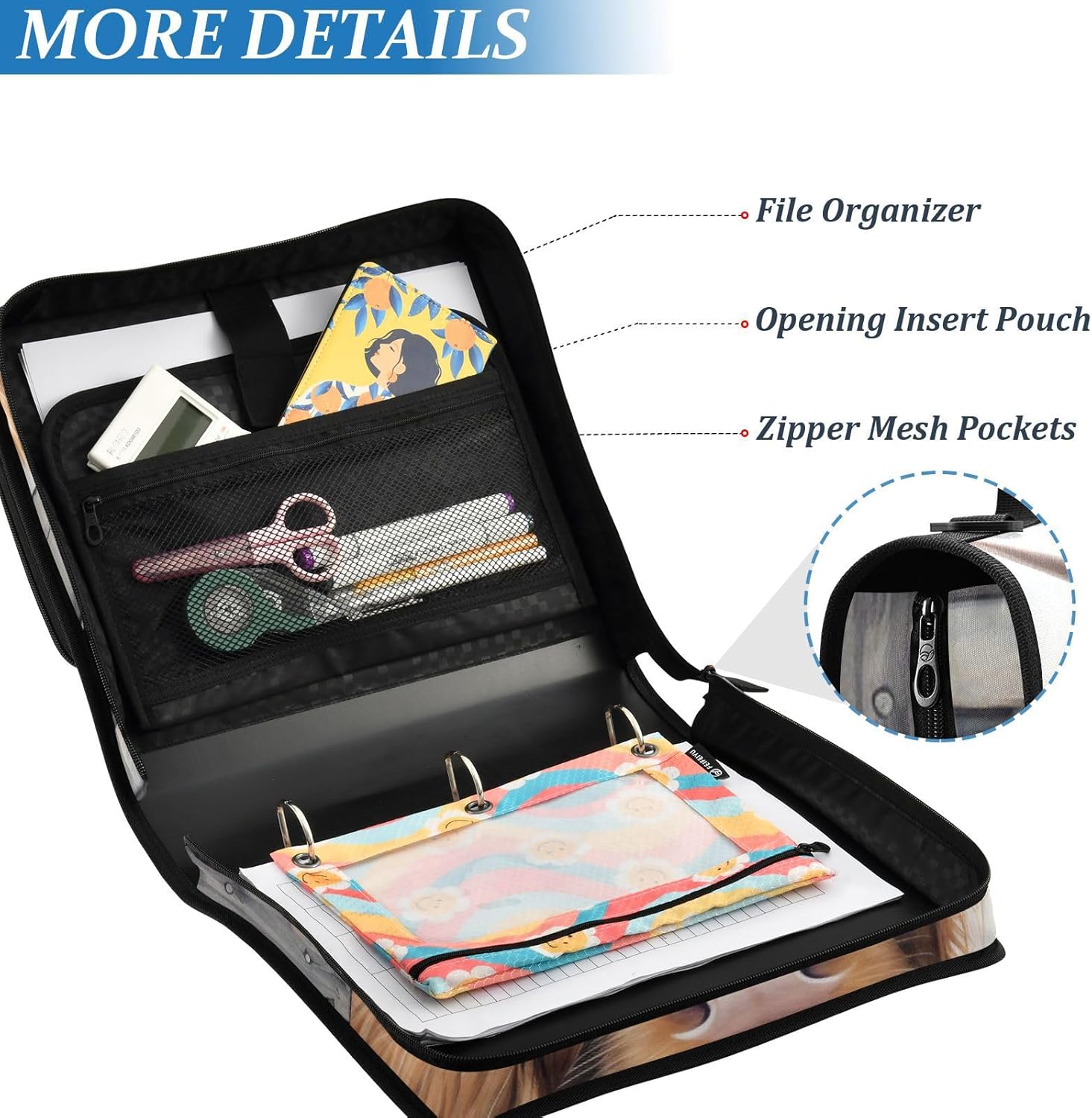 3-Ring Binder Portfolio Case Ring Binders Material: Polyester Size: 13.6x3.5x12.4in (34.5x9x31.5cm) Features 1.Surface is waterproof, easy to wipe clean 2.Multiple pockets to meet various storage needs 3.3-ring binder with 1.5 inch ring height, can easily store various documents and materials 3.Three different types of storage pockets, easy to open and close, organize scattered documents, suitable for placing thin and small items 4.ID cards, paper clips, USB drives, business cards, transport passes, legal documents Place of use Office, desk organizing problems, cafe restaurant menu, organize contracts, receipt, home organizing recipes Clean Just wipe it locally