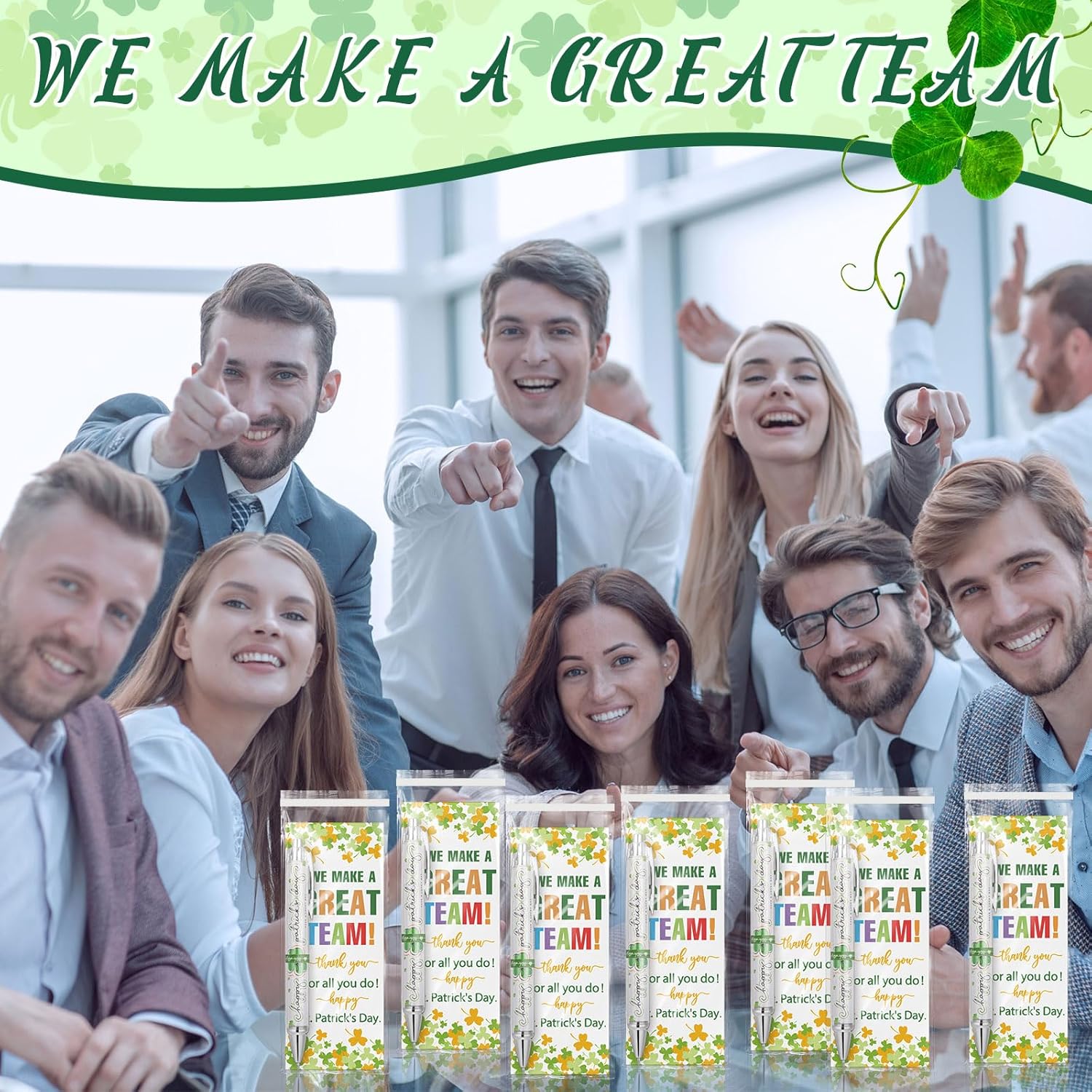 Features: Wide range of uses: The ballpoint pen set is suitable for a variety of occasions, such as the company's team building activities or employee training to enhance interaction and cohesion among employees, can be applied for various activities in schools or educational training institutions to encourage collaboration and team awareness among students, and can also be applied as a thank-you gift for teachers Quality plastic: Our St. Patrick's Day pens are made of plastic material, which is safe, durable, smooth surface, comfortable to use, allowing you to use it for a long time without fatigue Specifications: Material: plastic, card stock Color: green Size: St. Patrick's Day ballpoint pens: 5.51 inches/ 14 cm Happy St Patrick's Day team thank you cards: 5.91 x 2.36 inches/15 x 6 cm Package includes: 50 x St. Patrick's Day ballpoint pens 50 x Happy St Patrick's Day team thank you cards 50 x Green ties 50 x Small plastic bags Notes: Manual measurement, please allow slight errors on size. The color may exist a slight difference due to different screen displays.