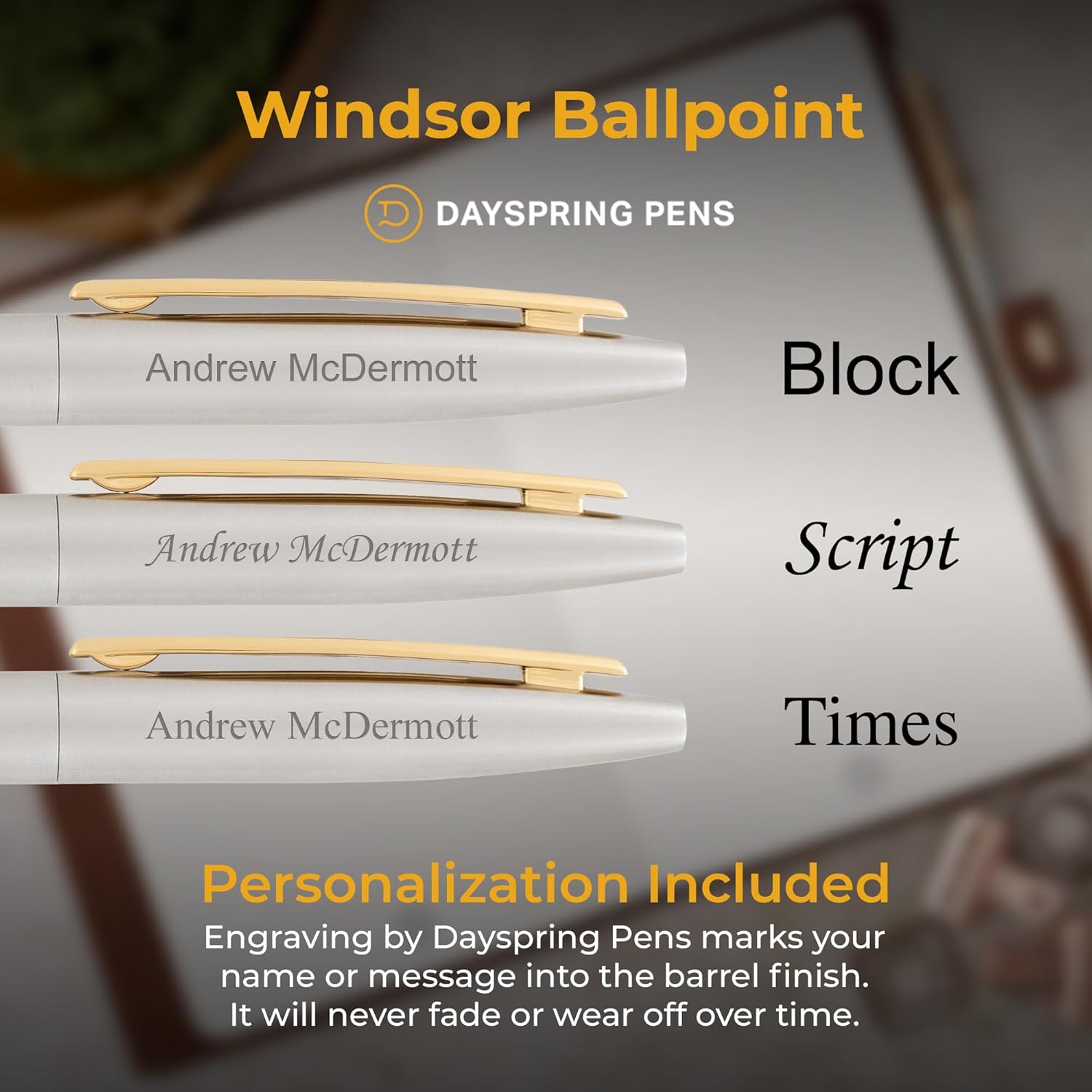 Welcome to the personalized Dayspring Pens Windsor Ballpoint Pen, a marriage of American modernism's clean aesthetics with precision engineering. Symmetrically designed to accentuated its lightly brushed stainless finish and matte gold clip, the Windsor creates a statement for professionals and those who gift intentionally. Both lightweight and robust, the pen offers a seamless writing experience. Its dimensions are thoughtfully crafted to provide a perfectly balanced feel, ensuring that every word flows smoothly with its silky black ink. A product of international collaboration, designed in the United States, built in Taiwan, and utilizing precision engineering, the Windsor Ballpoint Pen is a testament to global excellence. Each pen is custom engraved under the clip and presented in a gift box. Whether signing important documents, penning down your thoughts, or gifting it to someone special, the Windsor Ballpoint Pen by Dayspring Pens is an emblem of excellence.