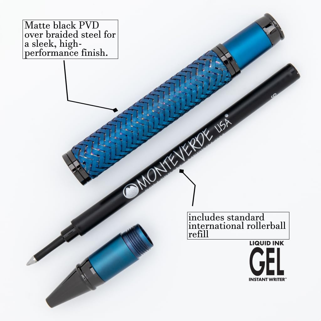 Experience the fusion of luxury and innovation with the Monteverde USA Innova Formula M Blue Rollerball Pen. Drawing inspiration from the high-performance world of racing, this pen features a 304 wire-braided stainless steel sleeve with a vibrant PVD coating over a solid brass barrel, offering both durability and a sleek, modern design. The rollerball pen provides a smooth and consistent writing experience and is refillable with Monteverde USA, Schmidt 888, or any standard rollerball refills. The pen’s construction, highlighted by a carbon fiber ring and gunmetal finishes, adds a touch of elegance to your everyday writing tasks. Presented in an elegant gift box, this pen is perfect for collectors and makes a thoughtful gift for any special occasion.
