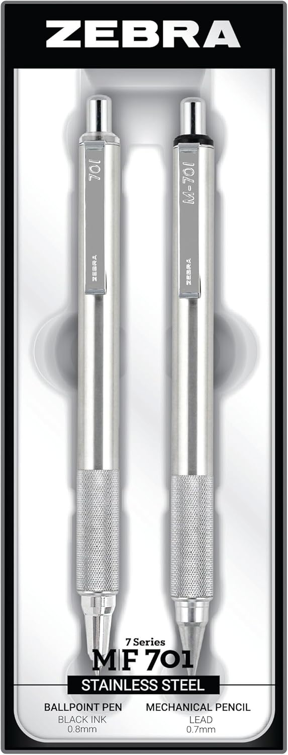 This trio of Zebra Pen premium metal barrel writing instruments pairs stylish design with superior functionality. Zebra Pen G-750 Retractable Gel Pen gives you the smoothness of a gel ink pen without the worries of smudges and smears. Rapid Dry Ink (RDI) Technology has been tested by a third party lab to have equal or faster dry time to industry leaders on nine common writing surfaces, making it the ultimate quick dry pen for the left handed. With its vibrant color, the 0.7mm medium point is perfect for everyday writing, document signatures and creative expression. This black ink pen has a sleek black weighted and balanced brass barrel, comfortable knurled grip, and convenient pocket clip. Slightly longer than its sister product G-450, the G-750 is a beautiful instrument with enviable performance. Zebra Pen F-701 Ballpoint Retractable Pen and Zebra Pen M-701 Mechanical Pencil have an authoritative feel and classy look with a stainless steel barrel and knurled grip for comfort. Innovative retraction plunger is soft and silent. Ballpoint pen has black ink and a 0.8mm point tip. Pencil fits standard 0.7mm lead. Impress your pen pal, sketch with confidence, up your bullet journal game or fill out your daily diary with a trusted, continually reliable writing experience with this 3-count pack of writing tools. G-750 pen is refillable with Zebra Pen’s JK Refill in black (88112), F-701 pen is refillable with Zebra Pen’s F-Refill in black (85512) or blue (85522), and M-301 pencil is refillable with Zebra Pen’s Mechanical Pencil Lead Refill (99911) and Eraser Refill (83211). This premium writing gift set of 1 mechanical pencil, 1 gel pen and 1 ballpoint pen is an excellent present for family, friends, colleagues and more. Give the gift of sophistication.