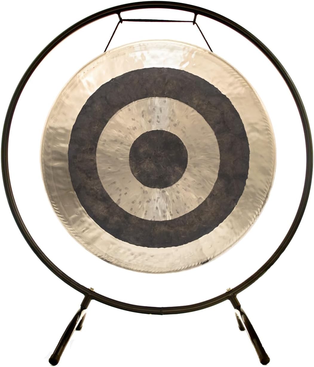 This combo includes the gong of your choice, Holding Space Gong Stand, and a traditional Chinese gong mallet.The Holding Space Stand is perfect for the minimalist! For the gong enthusiasts who prefer something less ornate, we offer this simple circular metal gong stand. Tubular, and light in weight, this gong stand is perfect for light or moderate playing. However, it is not for heavy, consistent playing. Minor assembly required. You need to tighten 2 screws!Stand Measurements: Length: 30.5"Height: 33"Depth of Feet: 17.5"