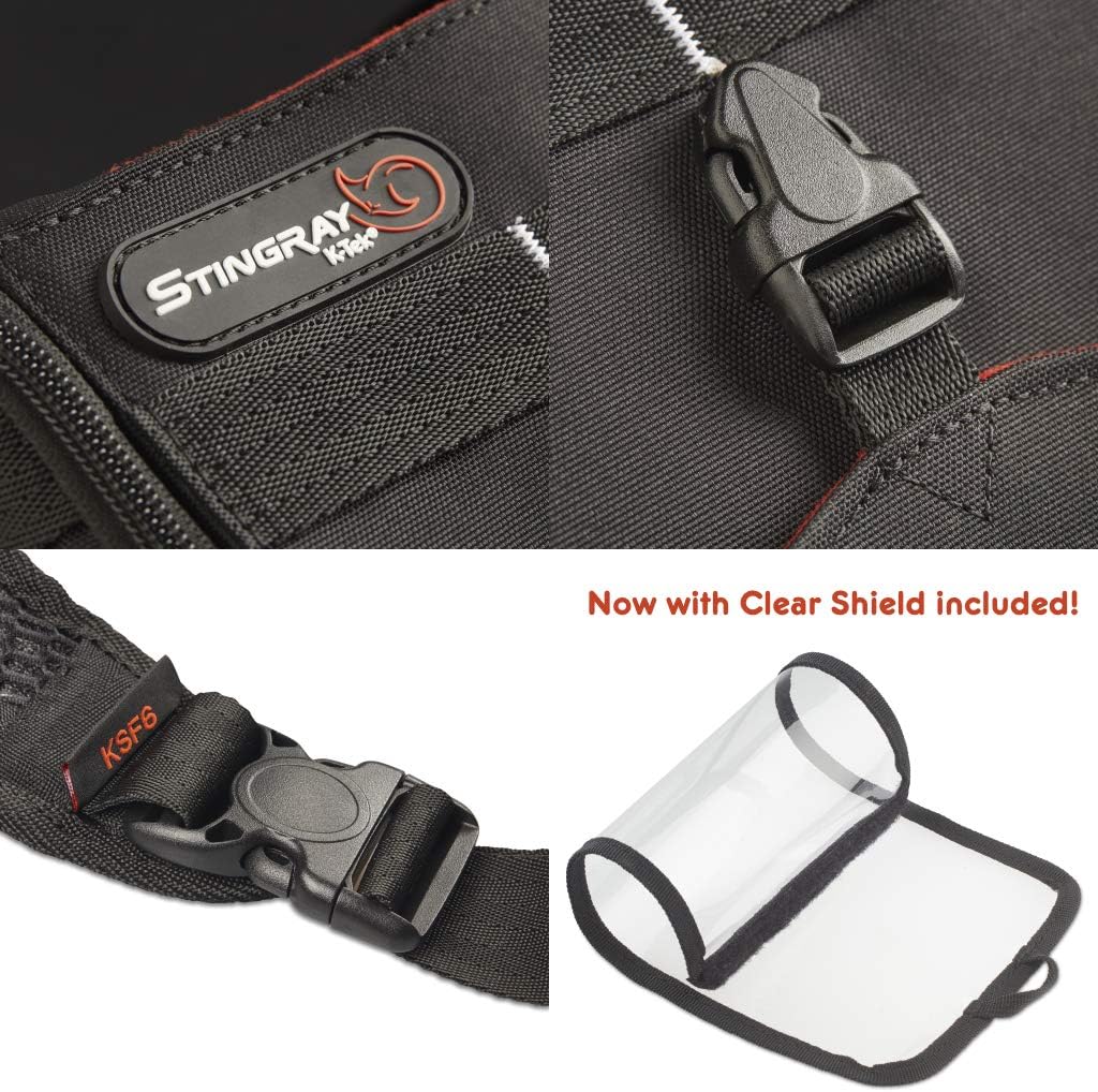 The KSF6 Stingray bag is the perfect companion for the Zoom F6 Mixer/Recorder. This versatile carrier offers safety and protection while accommodating common working styles with access to all Zoom F-6 connection points. In an updated version the KSF6 now comes with a Clear Shield included.Works with youWe listened to users who asked for easy access all around. Our answer is dual zippers that encircle each side panel to fully reveal inputs, outputs and controls. The bottom flap opens wide to access the internal battery packs on the bottom of the F6. Then there’s the large buckle that safely snaps the bottom closed.K-Tek also made it to suit whichever style you choose to work. Whether it is carried over the shoulder or worn around the body, the integral Waist Belt/Shoulder Strap is adjustable for various sizes. Made of breathable material and padded for comfort, it also offers two MOLLE rigging points to hold your additional accessories.For convenient tabletop operation, a built-in adjustable kickstand enables easy control interface and comfortable viewing whether you choose to sit down or standup.Extra ProtectionTo secure the F6, an integrated frame means more stability and protection. The multi-layer walls offer exterior durability and the soft orange high-contrast interior makes offers extra padding and makes it easy to visually separate the bag from the recorder. Inside, extra wide Velcro straps solidly hold the F6 for solid support. The new included Clear Shield offers additional protection for the Zoom mixer in light weather conditions.Handy HandlingAnd to hold accessories, there’s 6 oversize MOLLE-style straps positioned around the bag and belt. So you can add-on wireless receivers, other Stingray bags like the popular carryall Gizmo bags, and more.