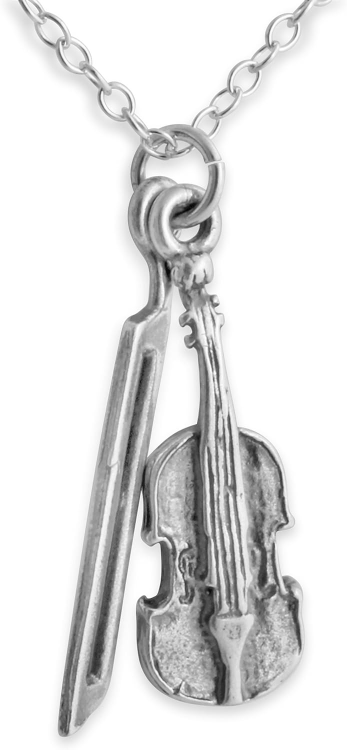 925 Sterling Silver Pendant Necklace 3D Violin and Bow String Musical Instrument