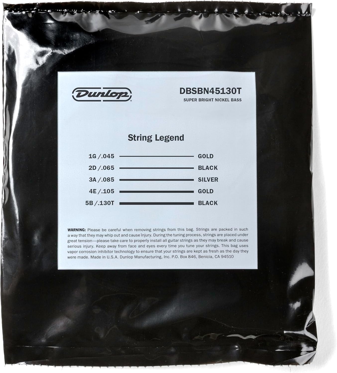 Dunlop Super Bright Bass Strings put your sound front and center with a crisp, vibrant top end and a fat bottom with a focused fundamental. Carefully designed by our team of bass players and tested by pros on the road, these strings sing with clear, defined highs that are supported by a fat, balanced bottom that keeps your sound full and round. Lighter tension provides a superior response to playing nuances, and the silky smooth feel of each string lets you get up and down the fretboard with ease and comfort. With extra-long life and exceptional string to string balance, Dunlop Super Bright Bass Strings allow the natural voice of your bass to come through. As with everything we make, we started from scratch and designed Dunlop Strings from the ground up to fit our vision of what a string should be. Each of our formulas is developed with on-the-road back from some of the greatest players in the world. At our headquarters in Benicia, California, we take a hands-on approach, running our machines at a slower pace and producing smaller batches, which allows us much more control at every step of the process. We also seal them in a protective bag for freshness and longevity. Every set of Dunlop Strings is the result of our obsession with details, which is ultimately an obsession with quality, consistency, and serving your needs as a player. Inside each pack of Dunlop Strings is more than 50 years of deep knowledge and experience gained from working with guitar players to further their playing experience. Made in the USA.